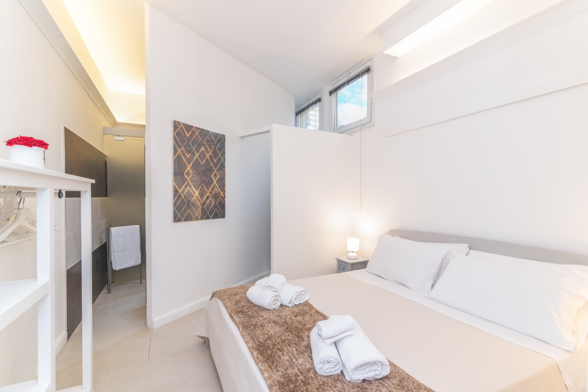 Bedroom 1: The master bedroom has a double bed, wardrobe, storage shelves and an en suite bathroom.