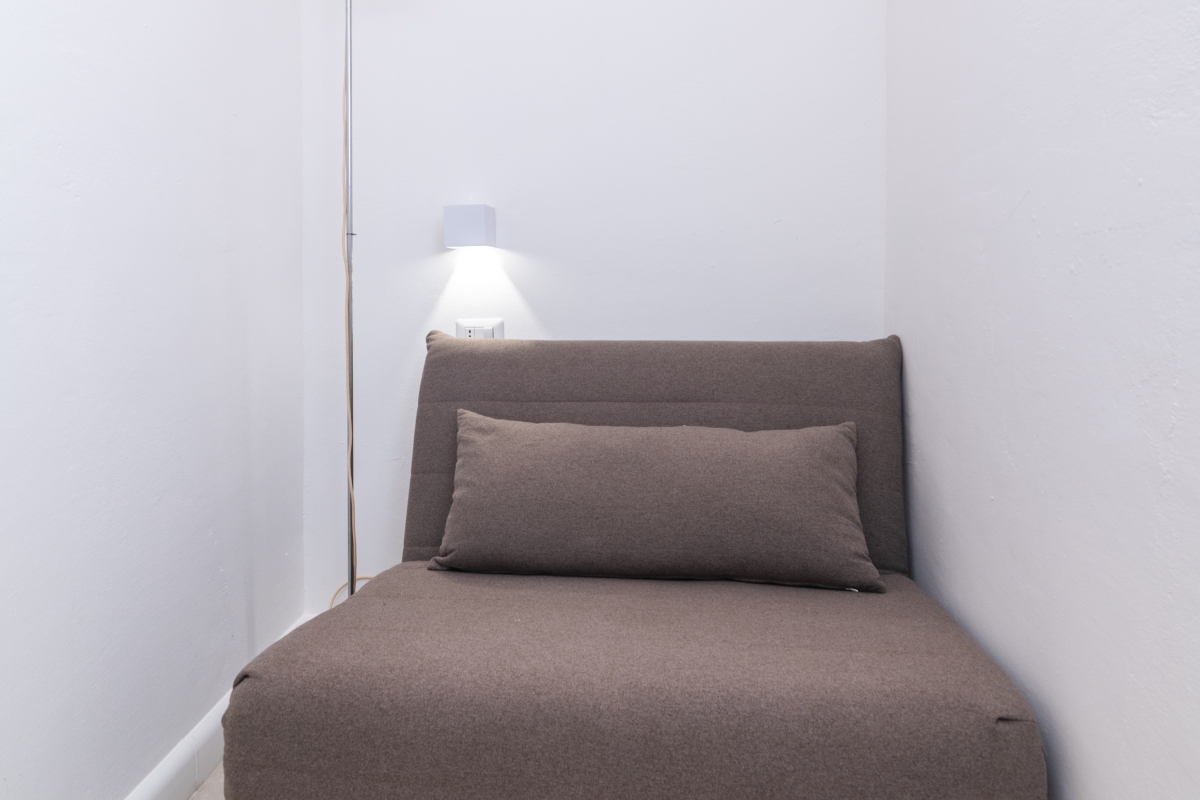 Bedroom 2: The second bedroom has a double bed, a single bed and an armchair