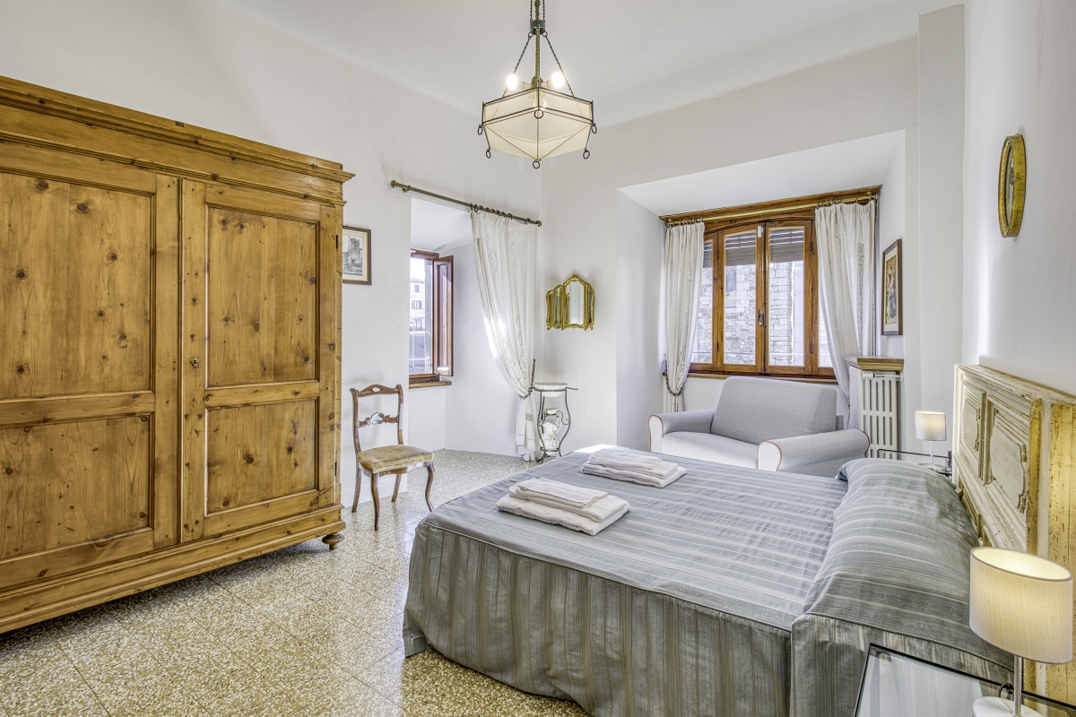The front door is just off the main square, and reached through a peaceful, private garden, with magnificent views over the neighbouring countryside. Elegant stairs lead from the entrance hall up to the first-floor living area. With terracotta floors and antique furniture, the apartment retains its original charm. The spacious living room is furnished with a sofa and armchairs, an open fireplace and a Smart TV. The adjacent kitchen/dining area includes a dining table and a well-equipped kitchen. The kitchen includes a cooker hob, oven, microwave, dishwasher, fridge and coffee machine.
