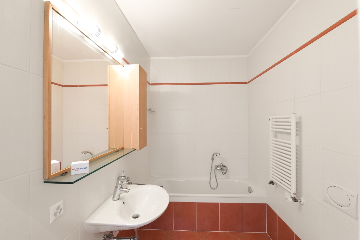 Inside, this super spacious retreat for 4 has an open living room with cushy sofas, a large Digital-TV, a dining table for 4 and direct access to the terrace through glass doors. The kitchen is separate and features everything you would need to whip up carefree meals and enjoy an effortless self-catered stay here; a dishwasher, induction hob, Nespresso machine, toaster, oven and fridge are at guests’ disposal.