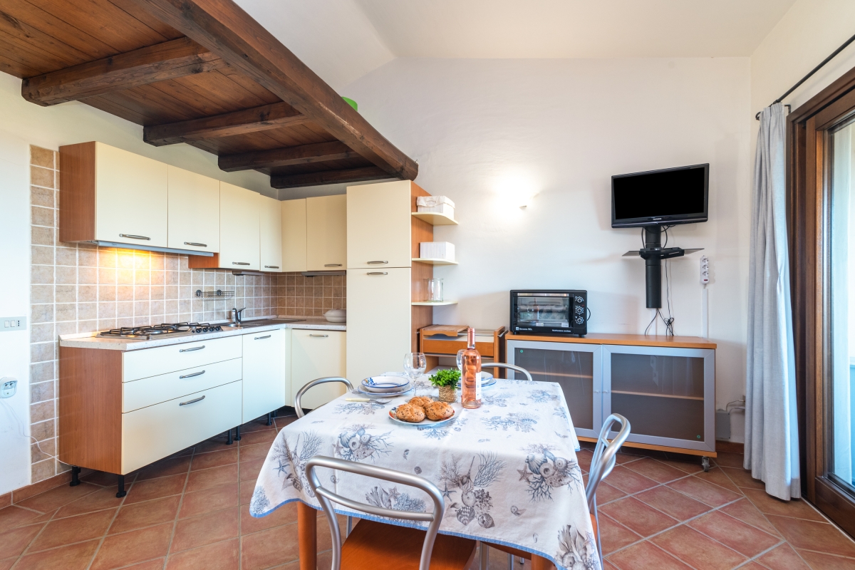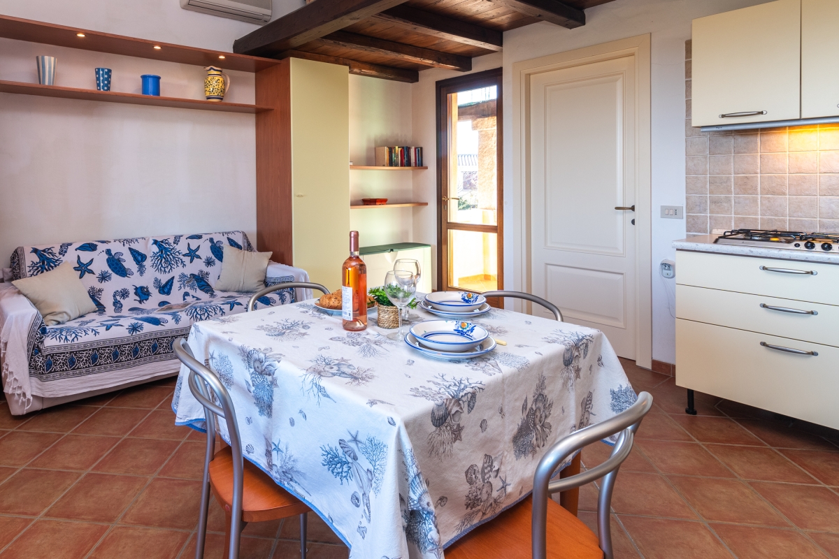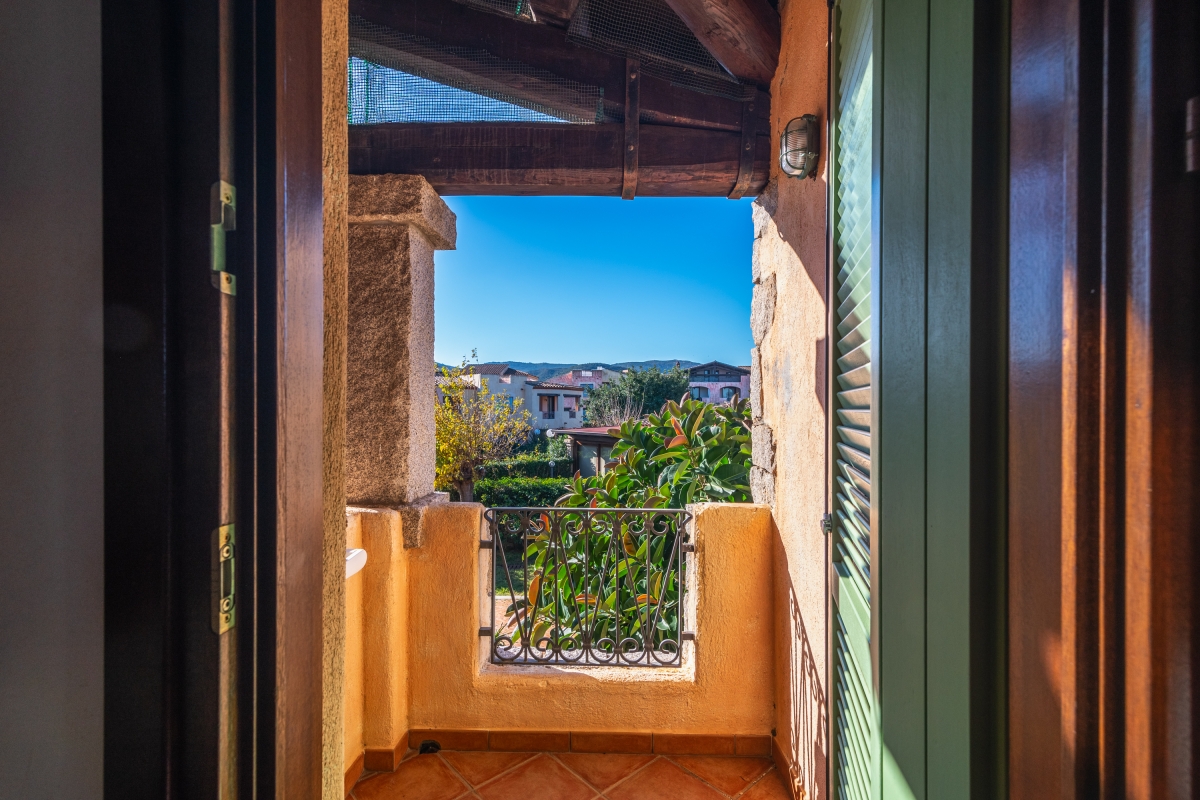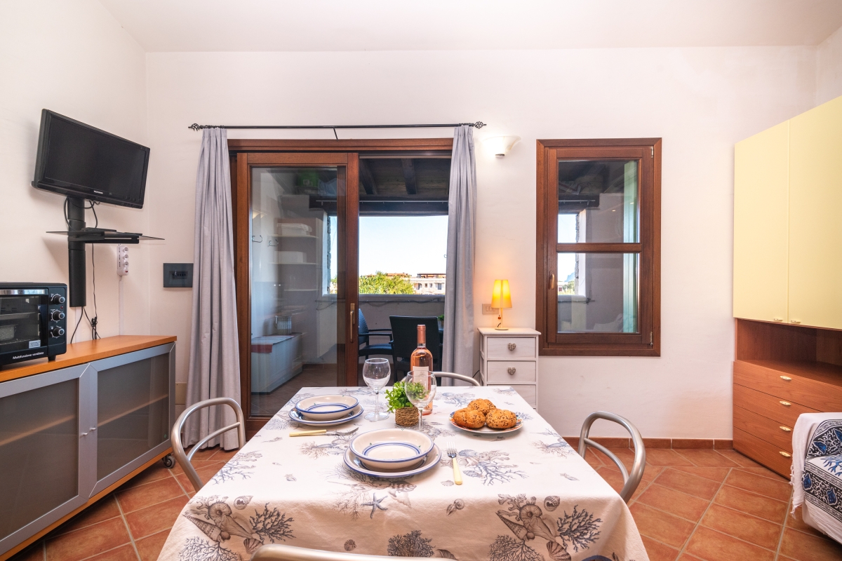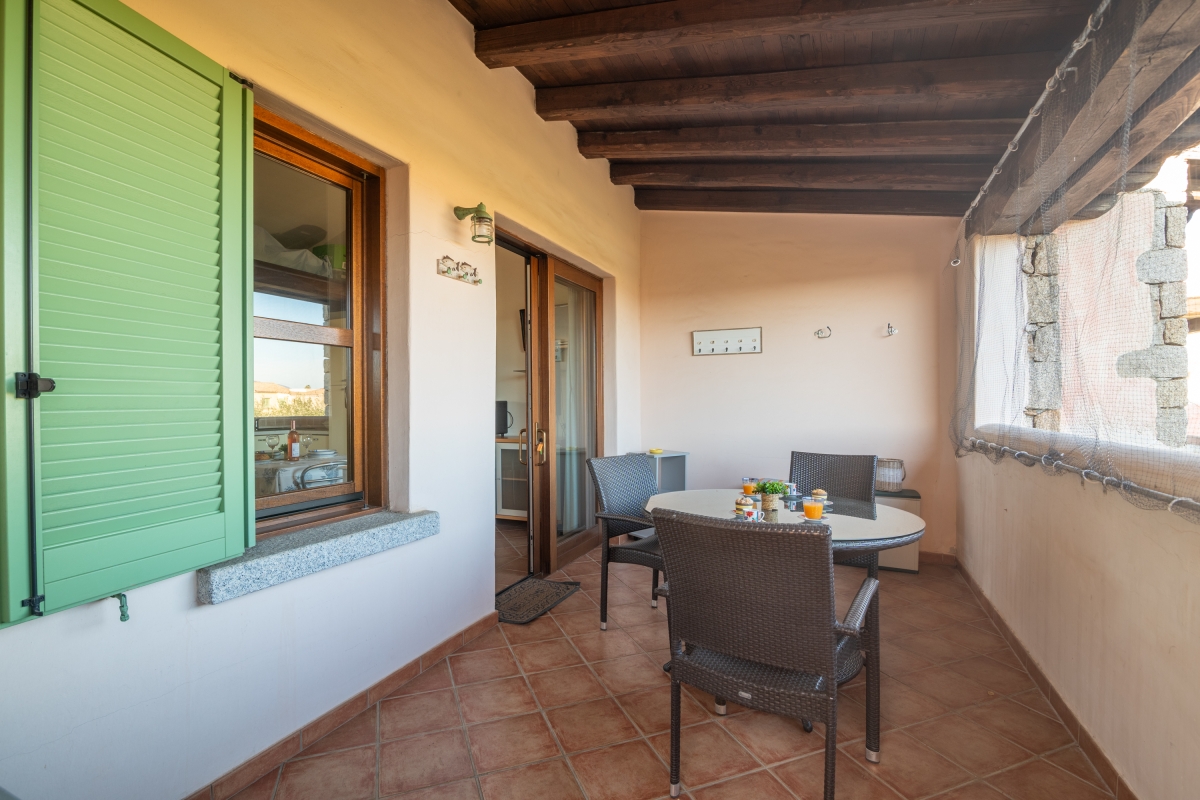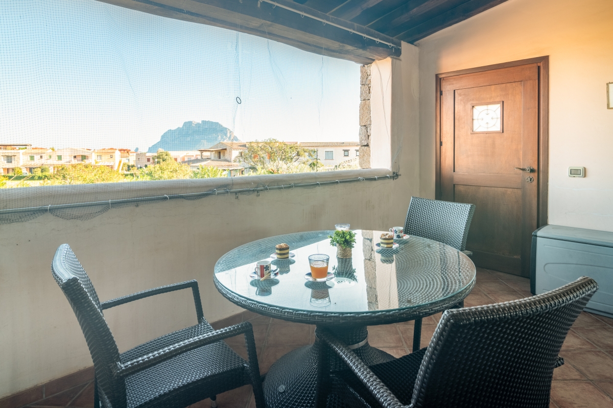 The apartment features a covered balcony with a table and chairs where guests can enjoy shady meals al fresco with views across the resort to the Island of Tavolara.