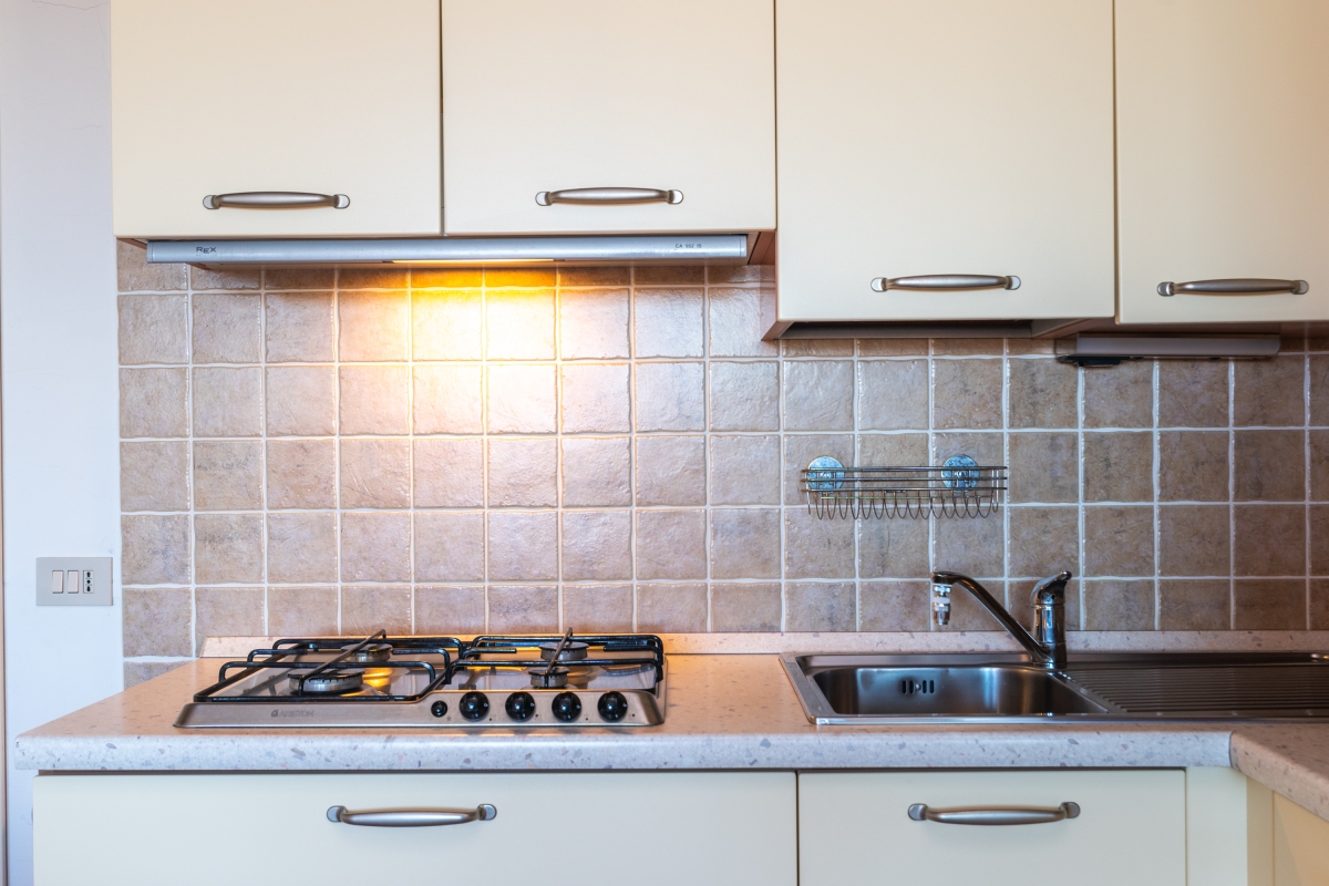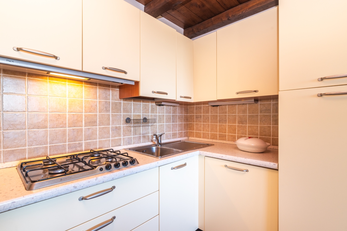 The open-plan living space incorporates a small kitchen and is furnished with a comfortable double sofa bed, a flat-screen TV, a dining table and chairs. The kitchen is well-equipped with a Moka coffee machine, a cooker hob, an oven and a fridge freezer.