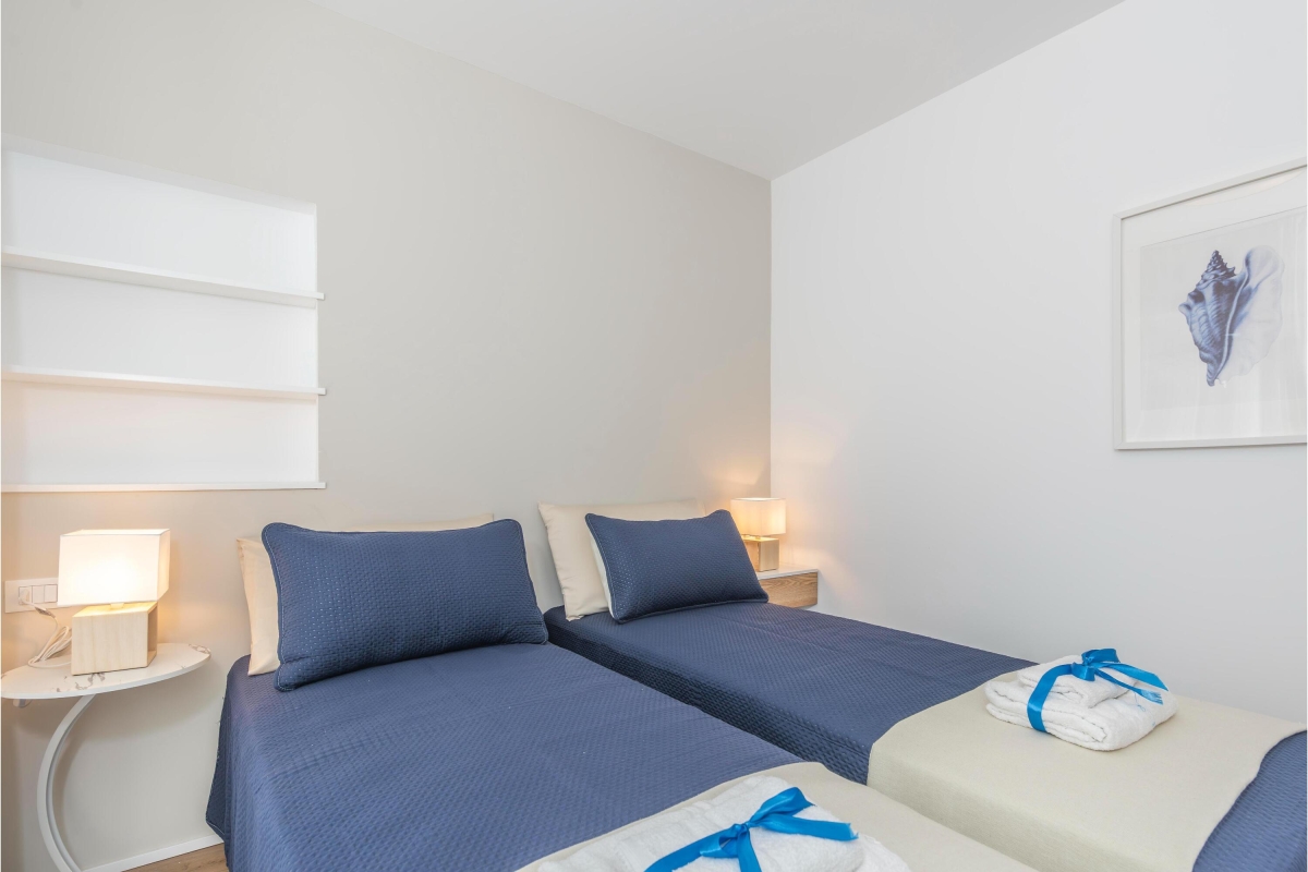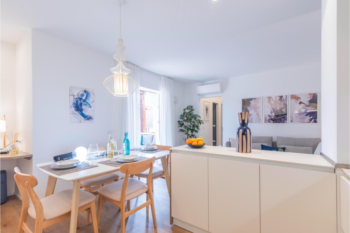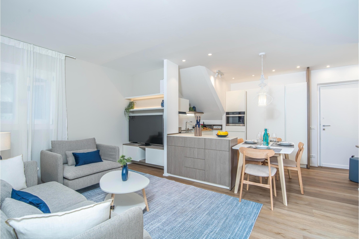 The apartment is located on the first floor and enjoys a comfortable open-plan living space that incorporates the kitchen and is furnished with; a flat-screen TV and a cleverly designed built-in dining table and corner sofa. The kitchen is fully equipped with a Moka coffee machine, an induction hob, a microwave, a dishwasher and a fridge freezer.