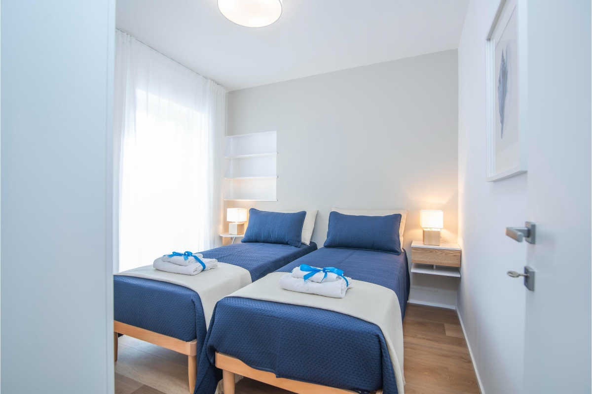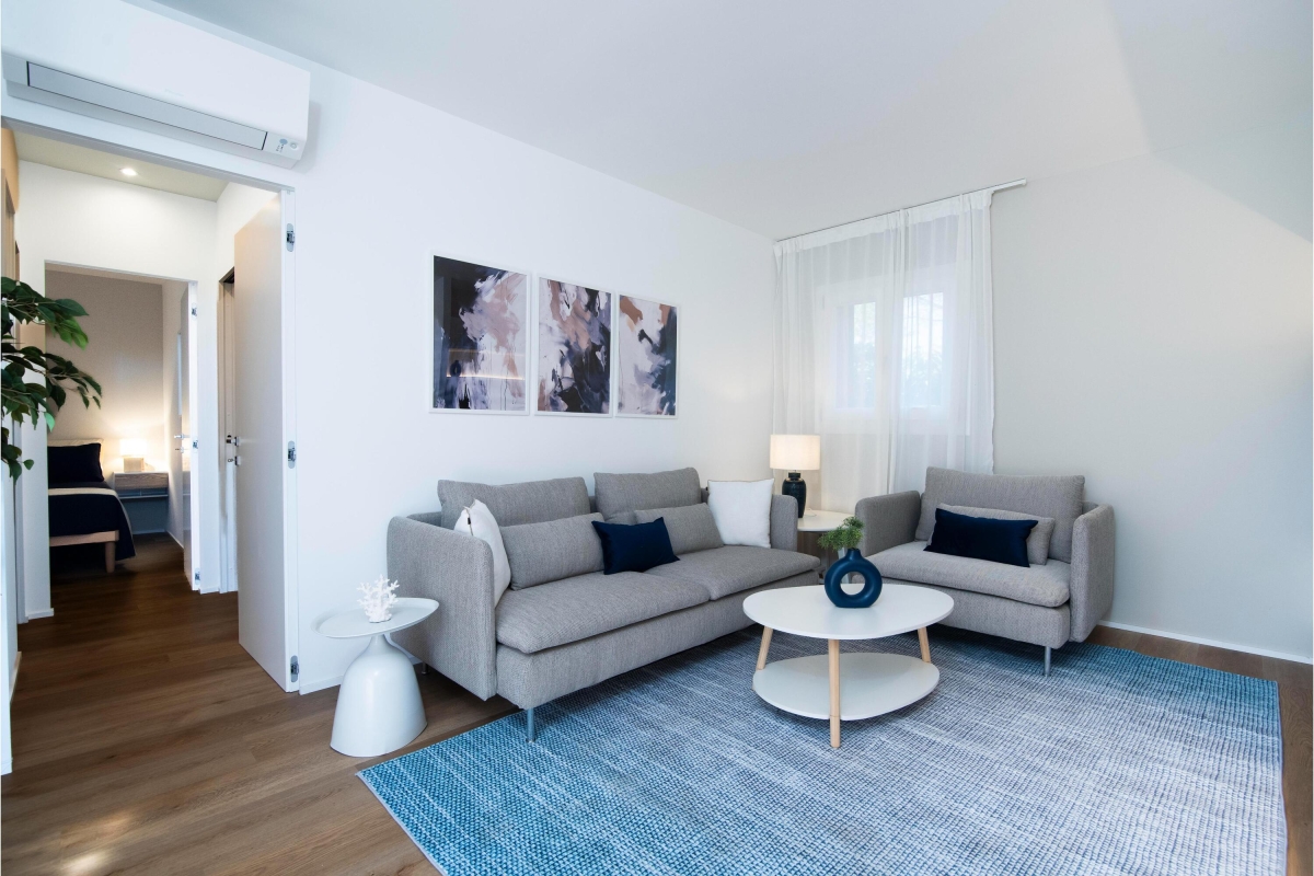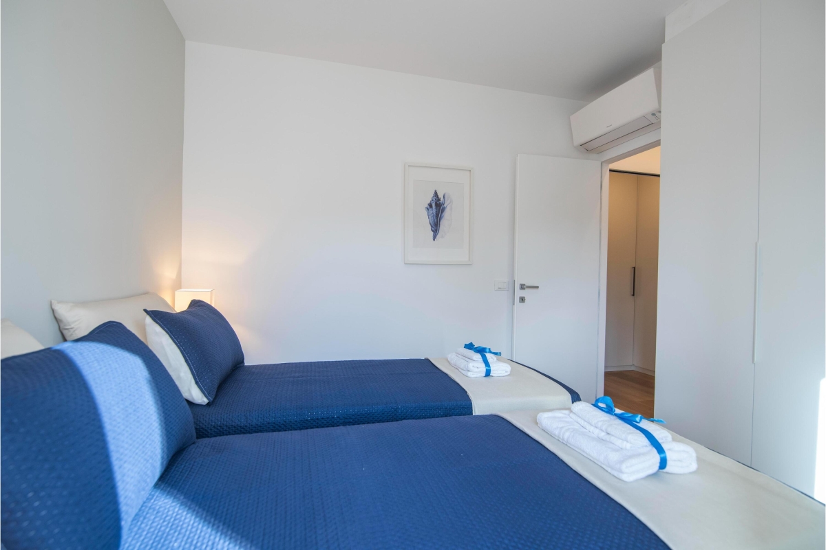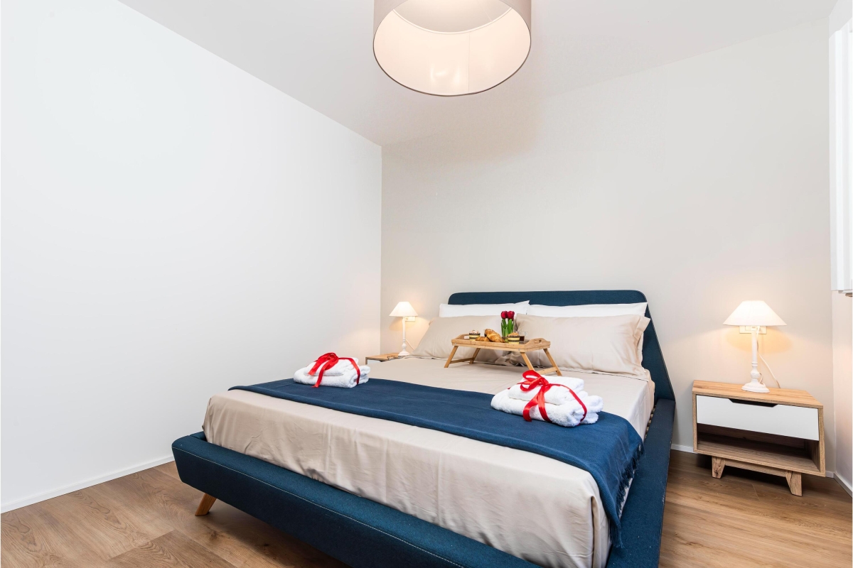 The apartment is located on the first floor and enjoys a comfortable open-plan living space that incorporates the kitchen and is furnished with; a flat-screen TV and a cleverly designed built-in dining table and corner sofa. The kitchen is fully equipped with a Moka coffee machine, an induction hob, a microwave, a dishwasher and a fridge freezer.