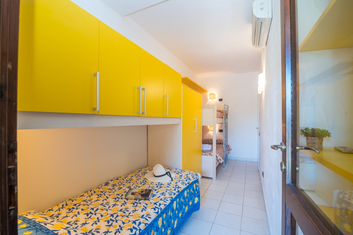 Bedroom 2: The second bedroom has a bunk bed and a single bed, plus extensive storage and a wardrobe. A glass door leads out to the private garden.