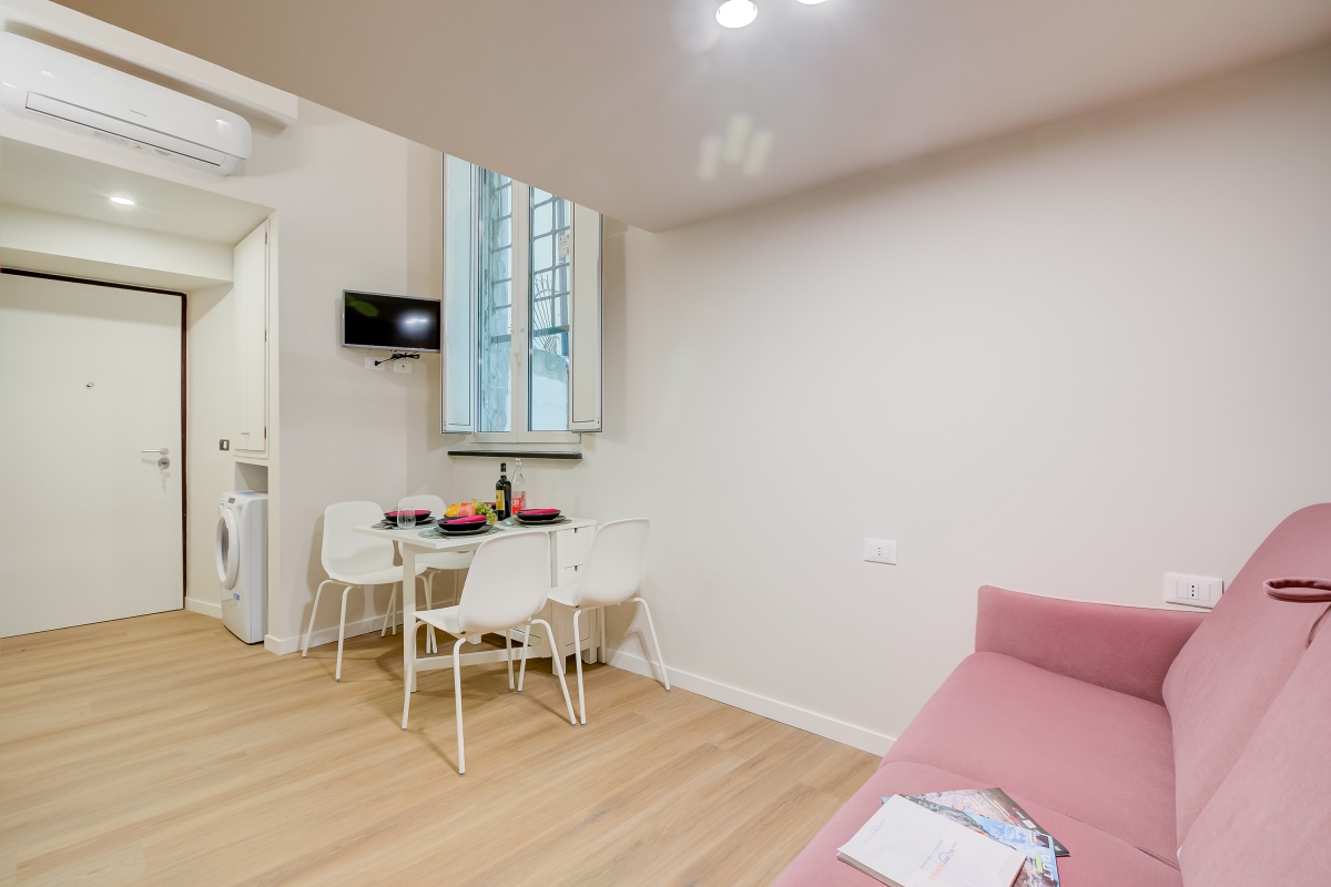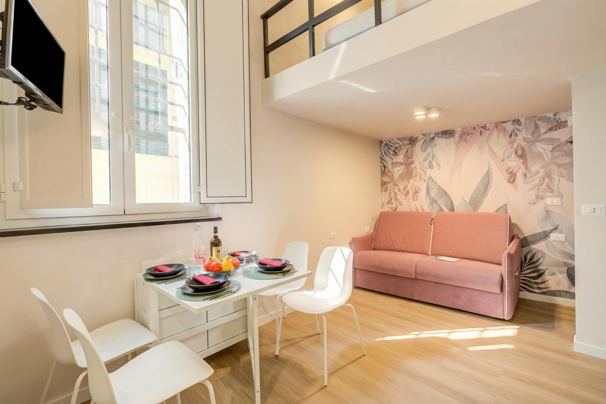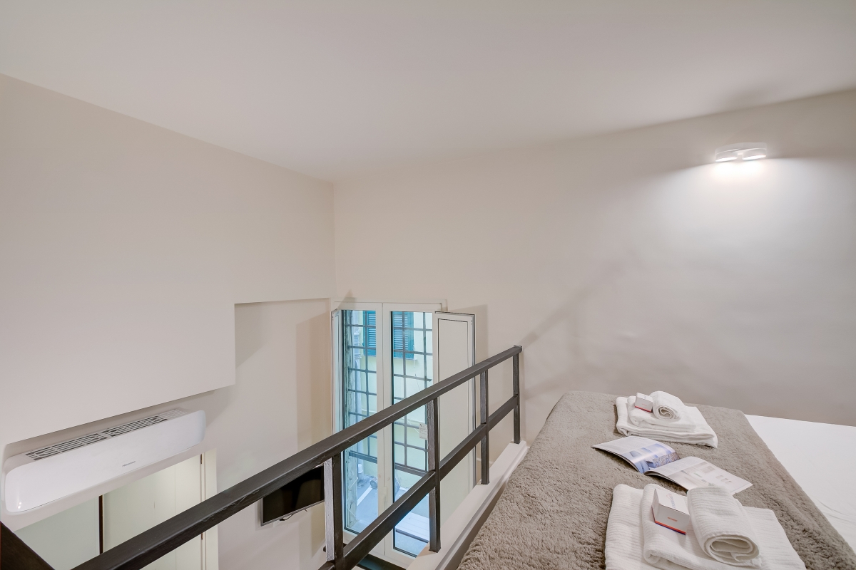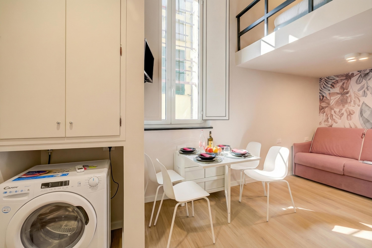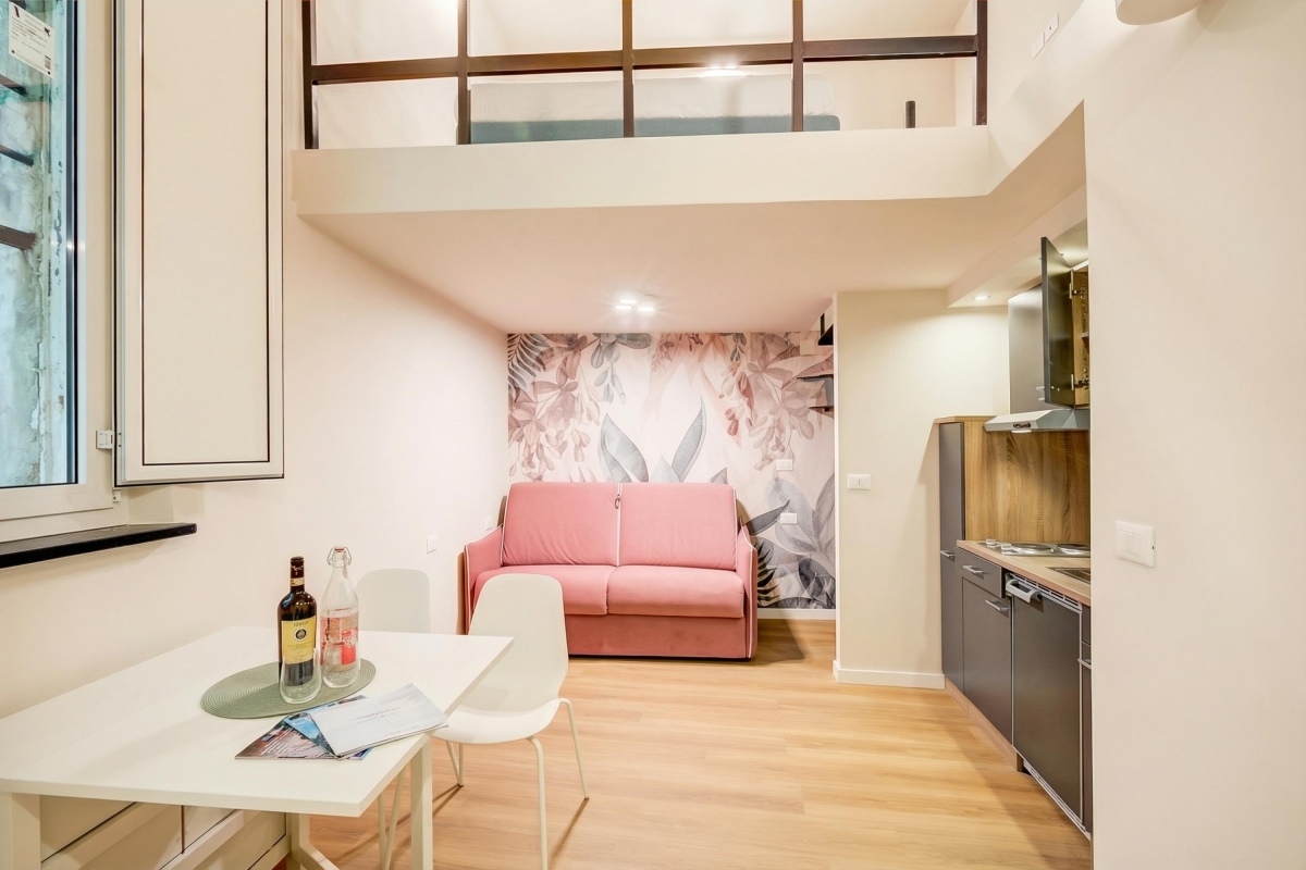 The apartment is stylishly decorated and has a double-height living area. There is a sofa, a dining table for 4 and a flat-screen TV, with a large, high window. The open-plan kitchen is equipped with an induction hob, microwave, dishwasher, Moka coffee machine and fridge/freezer.
