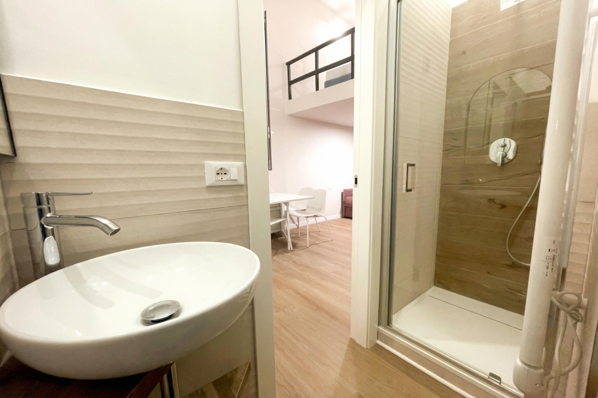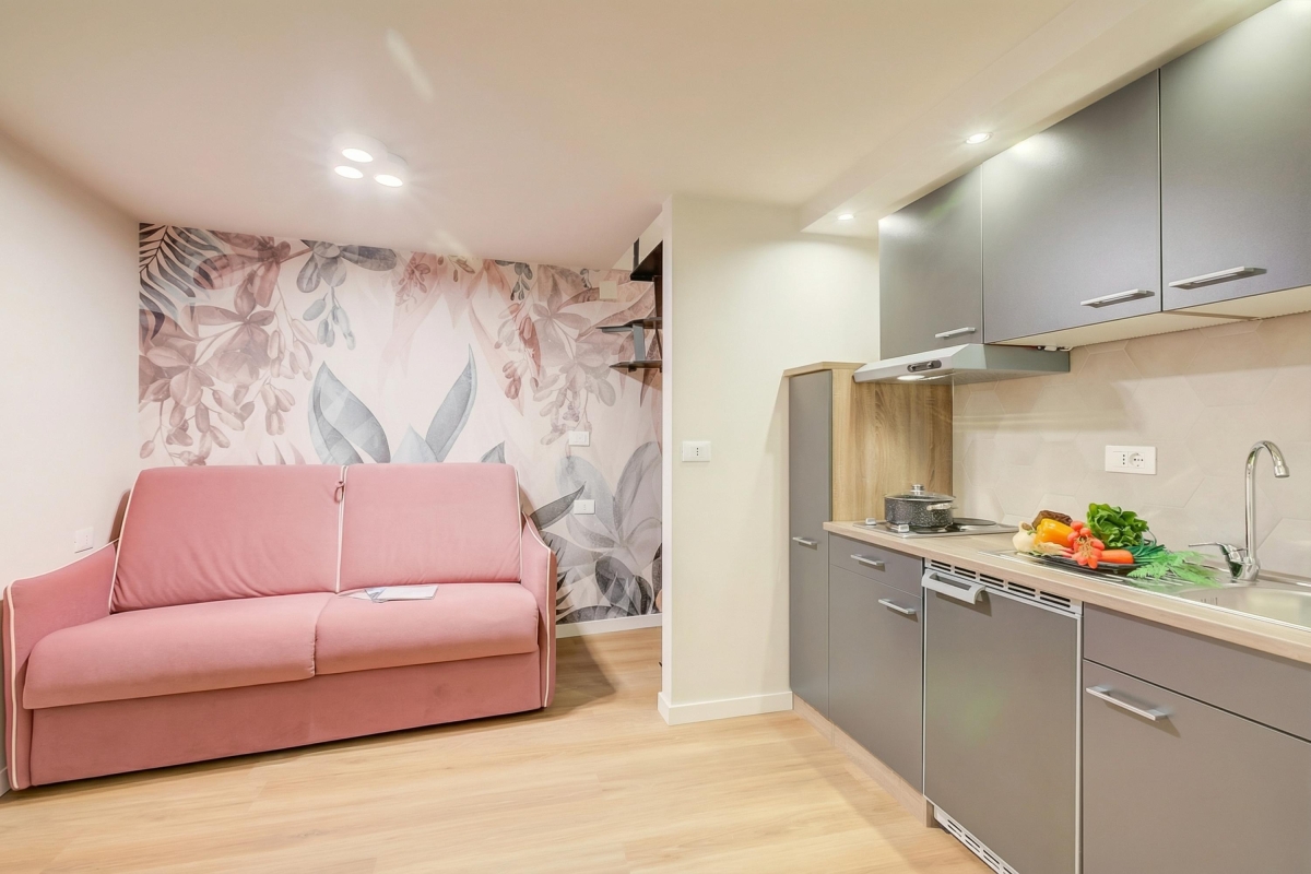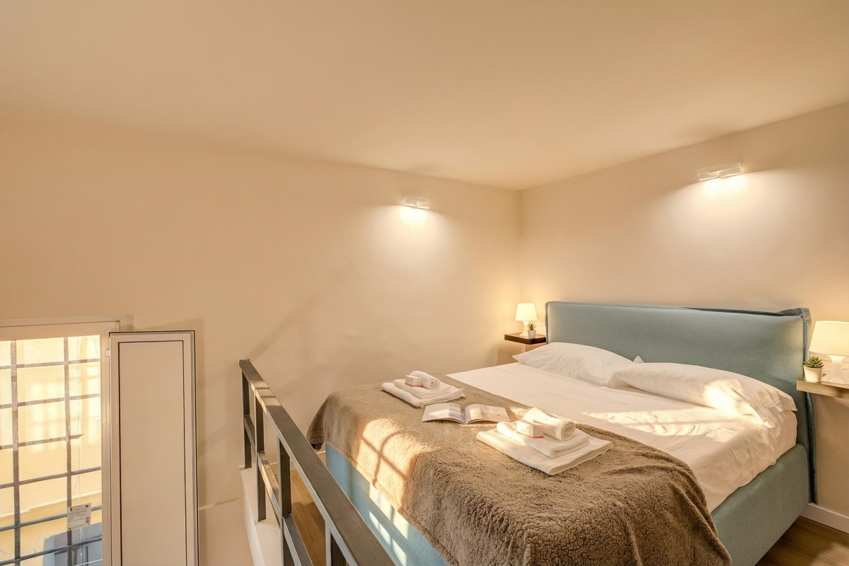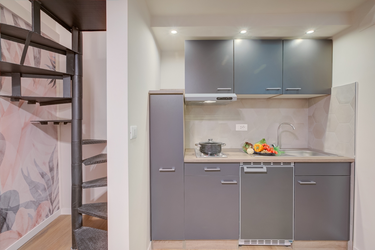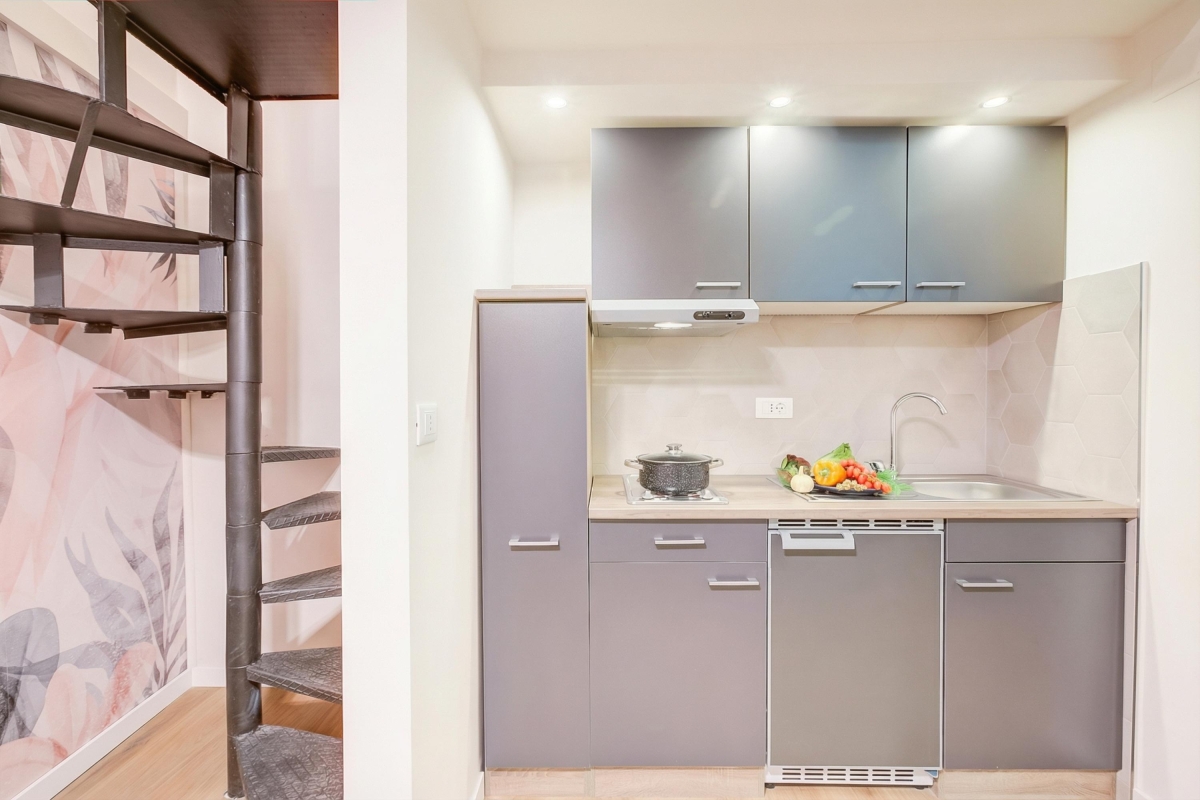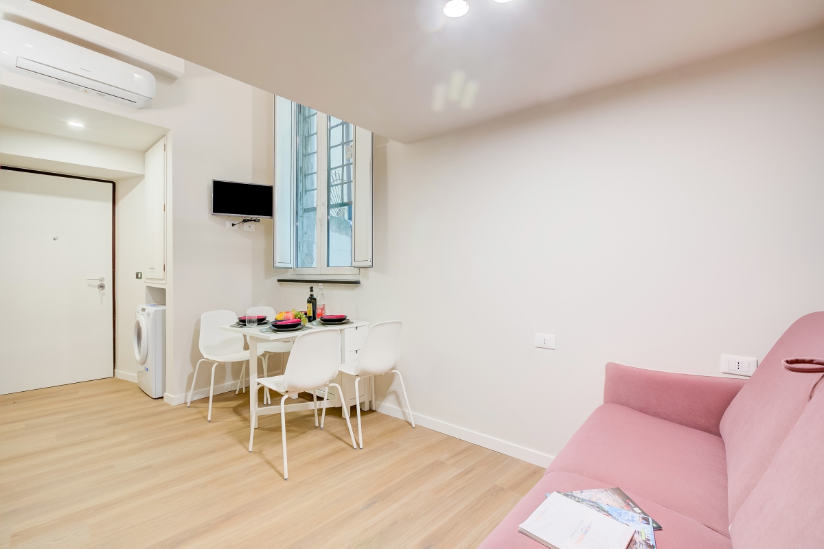 The apartment is stylishly decorated and has a double-height living area. There is a sofa, a dining table for 4 and a flat-screen TV, with a large, high window. The open-plan kitchen is equipped with an induction hob, microwave, dishwasher, Moka coffee machine and fridge/freezer.