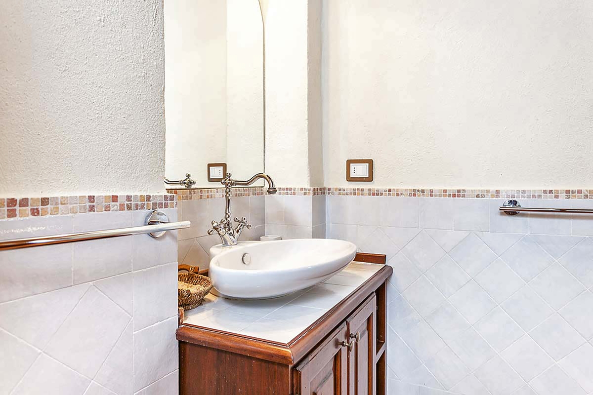 With terracotta floors and beamed ceilings, the apartment retains the original charm of the old house. The living/dining room has an open fireplace, in front of this is a dining table and chairs, plus a sofa and flat-screen TV. Elegant tiled stairs lead up to the master bedroom. Through an archway off the living room is an attractive fitted kitchen which is well-equipped with a cooker hob, oven, dishwasher, fridge, freezer and coffee machine.