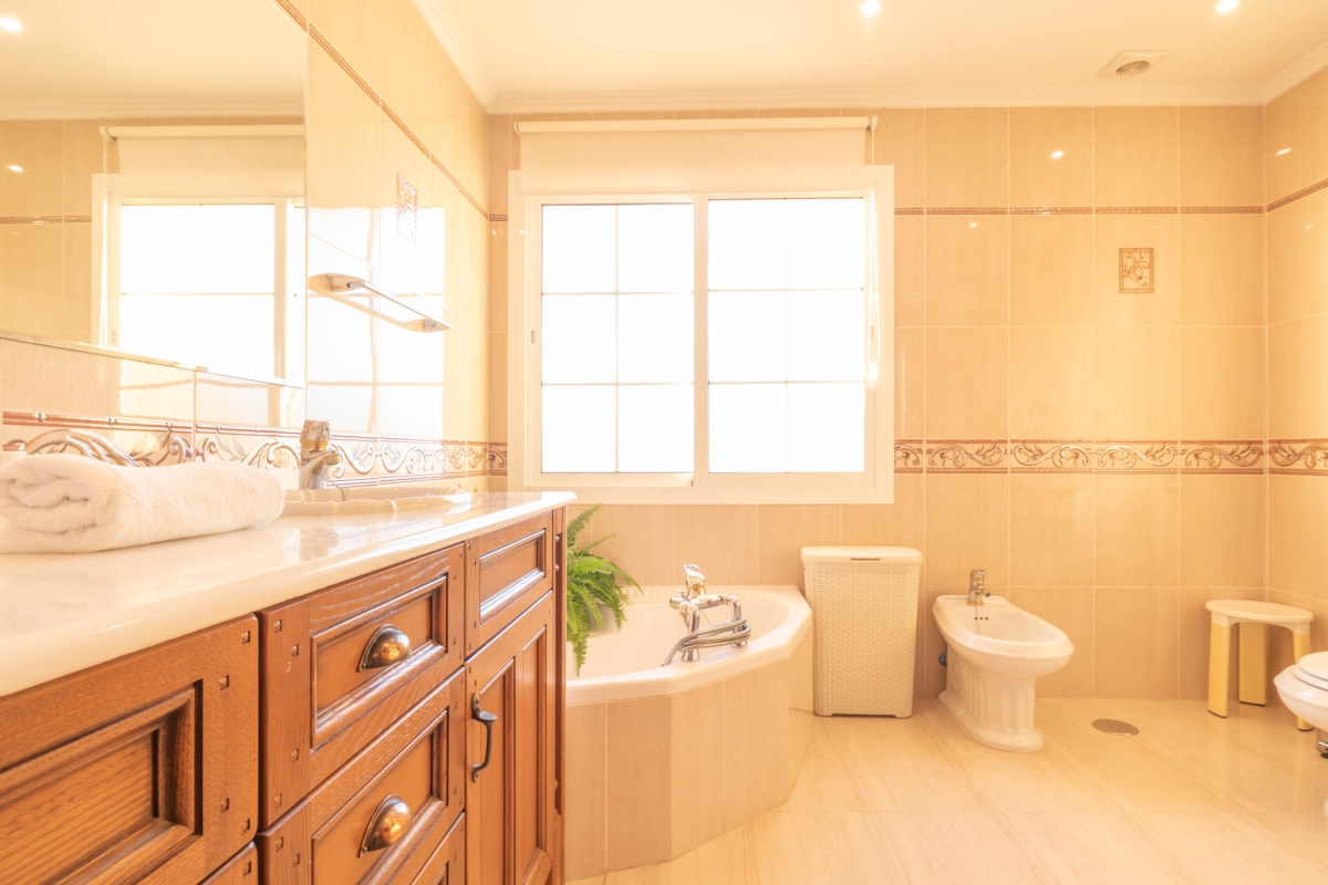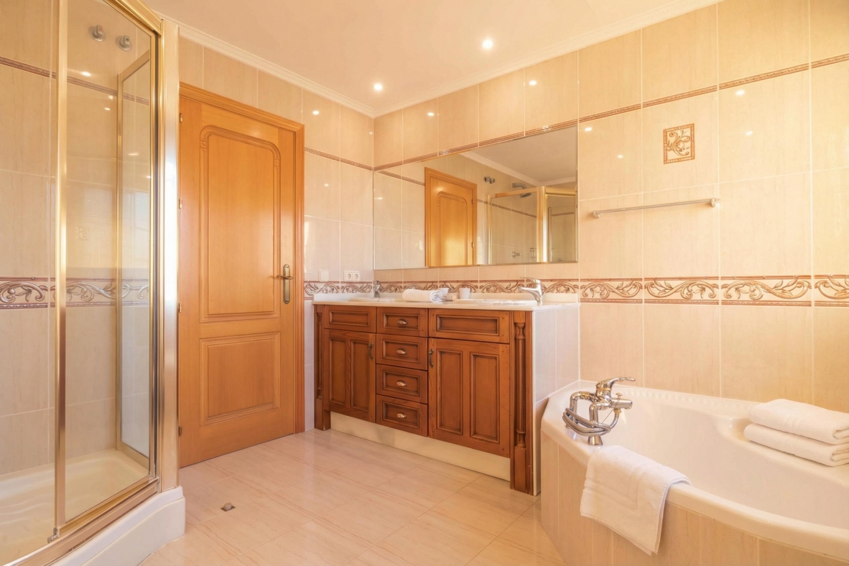 Bathroom 1: A well-lit and spacious bathroom with a bathtub, a shower, a bidet and a WC.