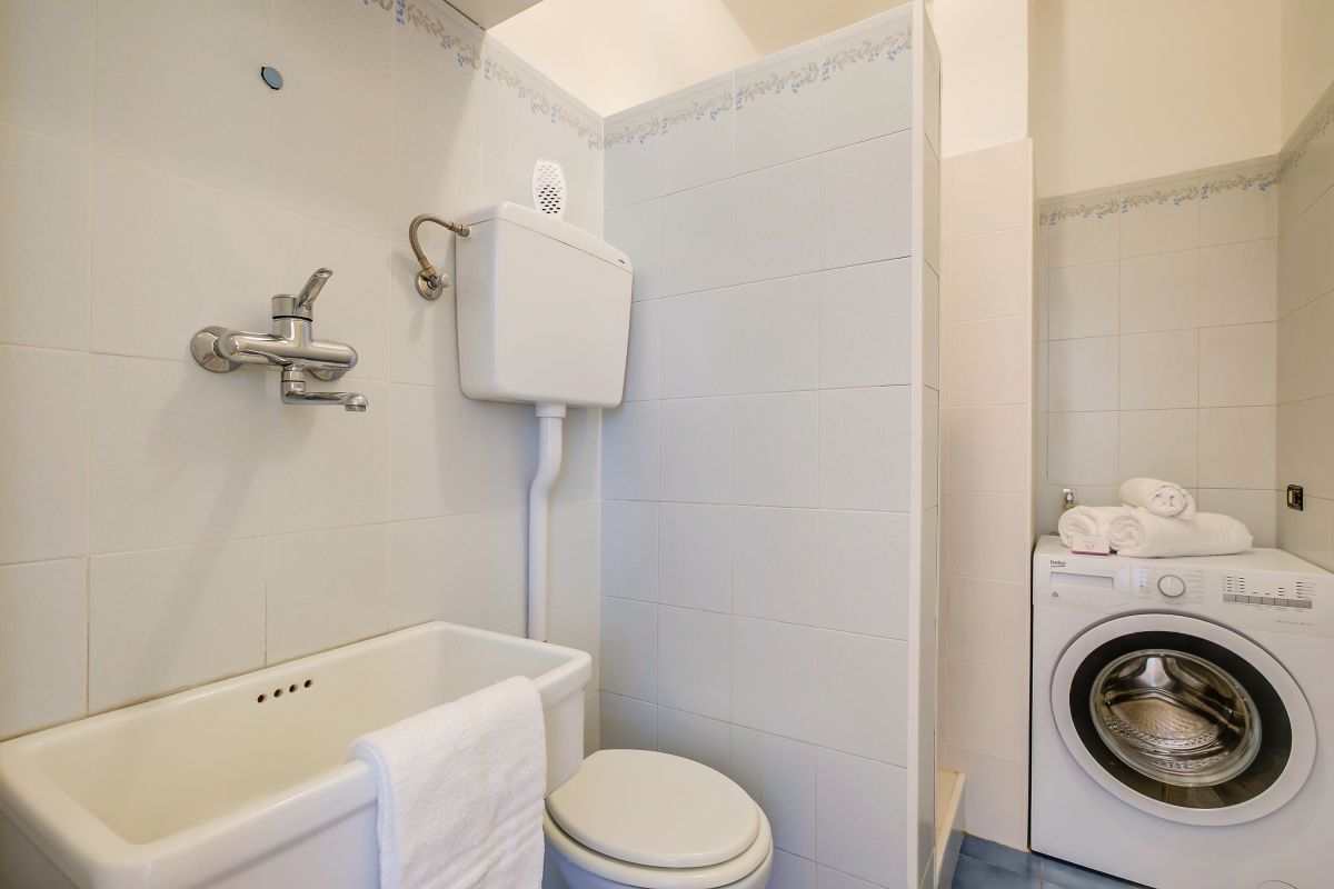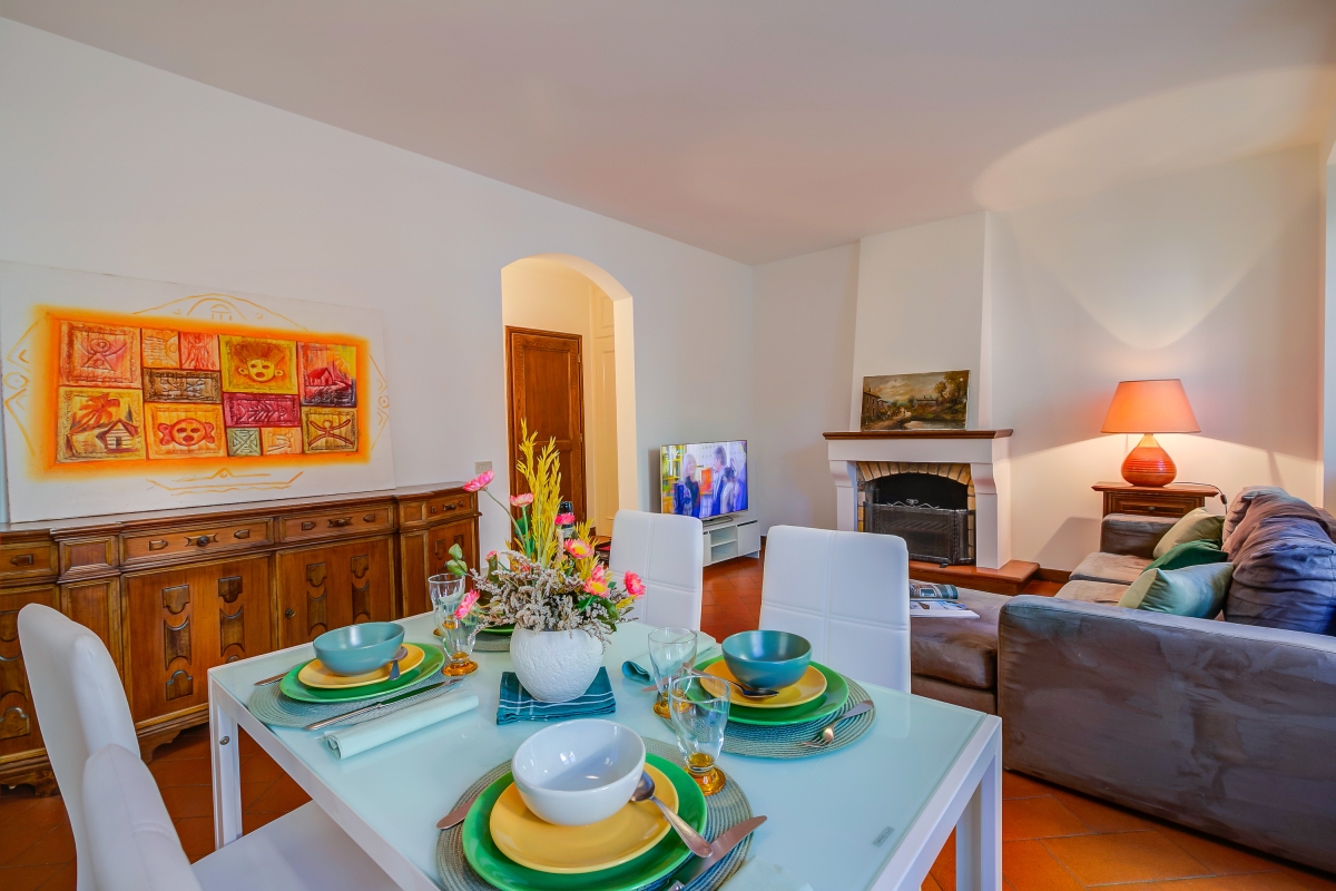 Inside, the apartment enjoys a large open-plan living space furnished with a comfortable sofa, a smart flat-screen TV, a dining table and a fully equipped kitchen fitted with; a cooker hob, an oven, a dishwasher, a Mokka coffee machine and a fridge freezer. This area enjoys a cool terracotta tiled floor and leads out to a small balcony overlooking the street below, the perfect place for morning coffee whilst watching the world go by.