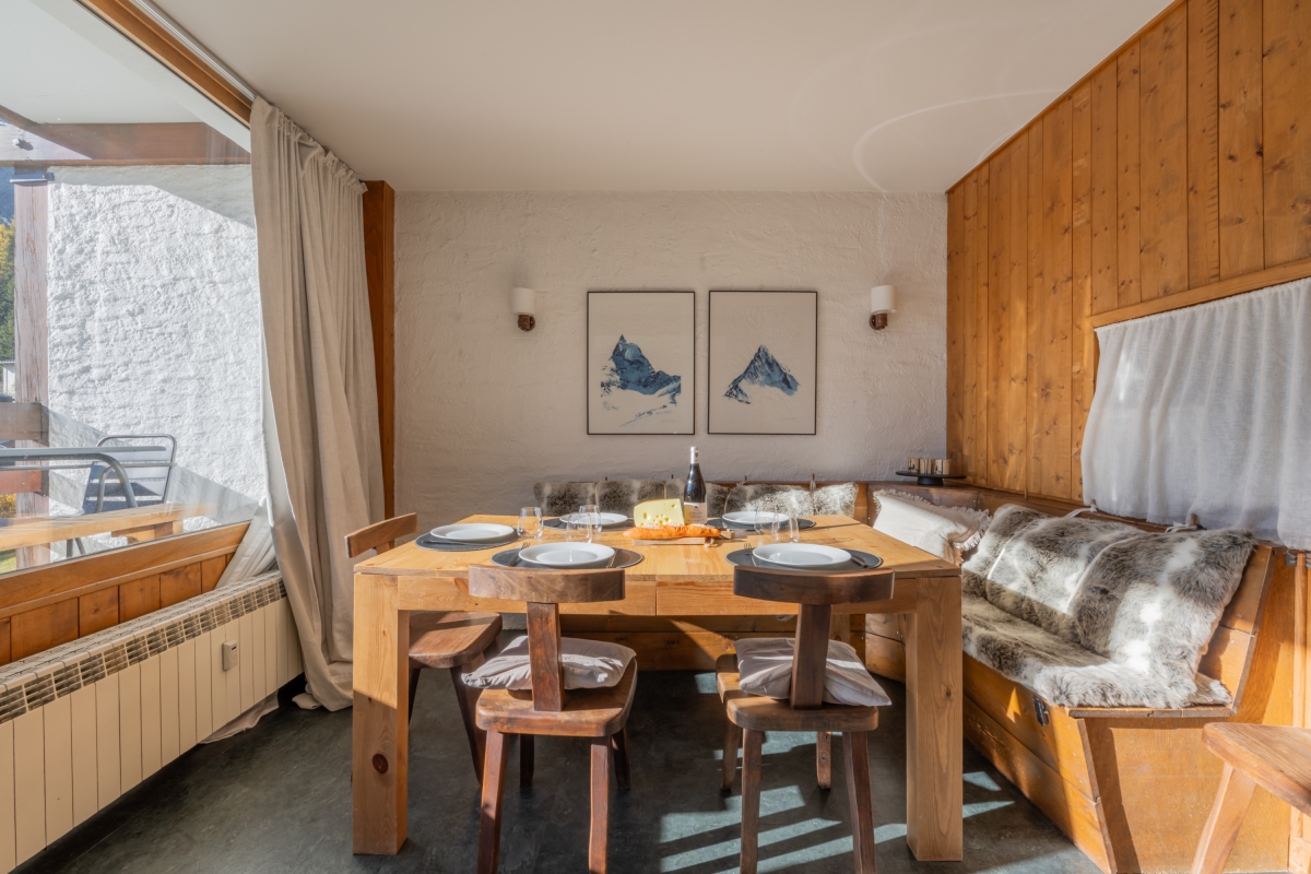 The apartment sleeps 5 people. The owners have taken great care with the décor and have created a comfortable, relaxing retreat. The spacious living area is slightly divided, with a cosy seating area, furnished with a sofa, wooden armchair and flat-screen TV. At the other end of the room is an attractive dining set-up with a corner banquette and a glass door which leads out onto the private balcony. Here guests can sit and enjoy a cup of coffee whilst enjoying the view. The is off the dining area, with a serving hatch linking the two rooms. The kitchen is well-equipped with a cooker hob, microwave, oven, fridge, raclette, fondue and coffee machine.