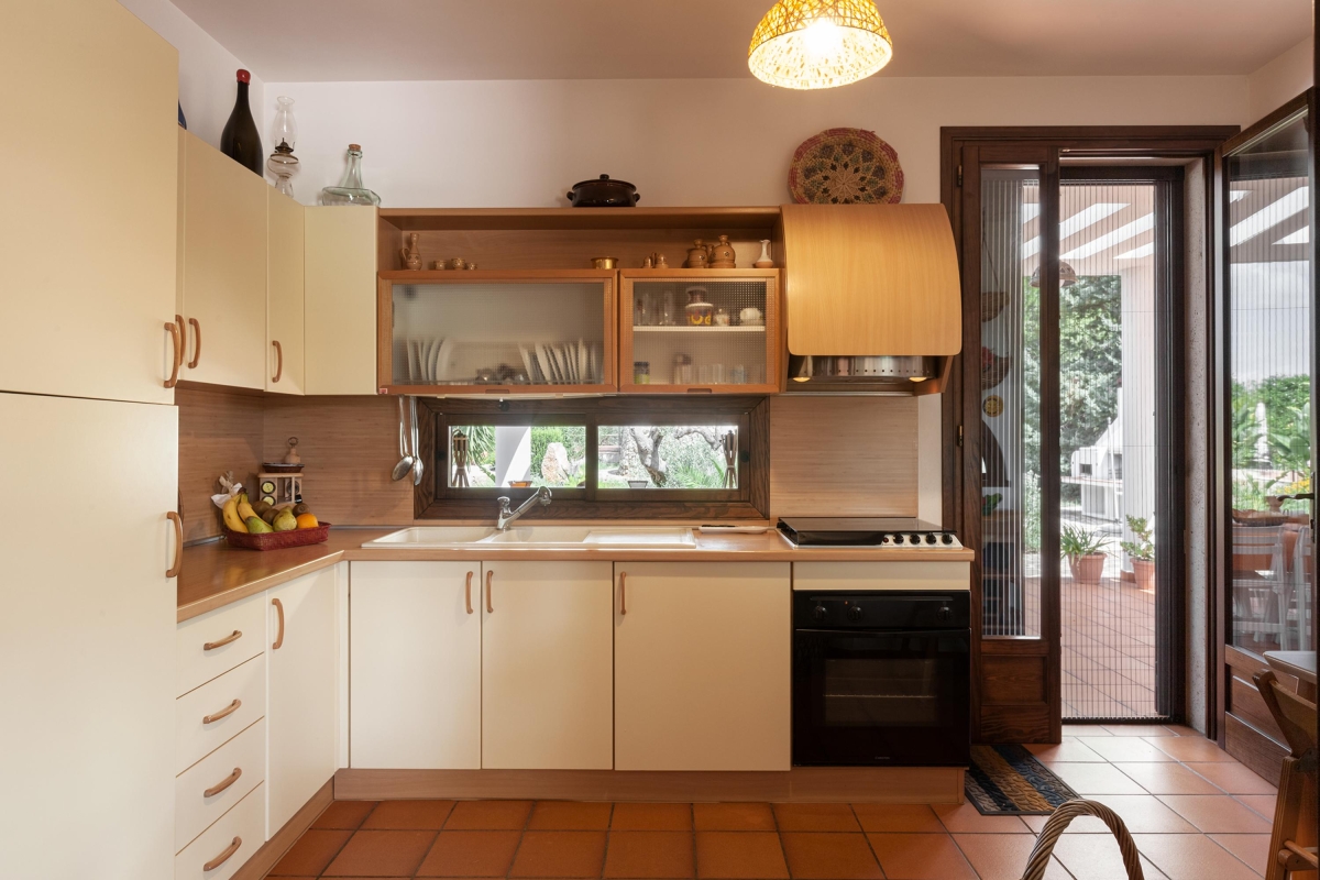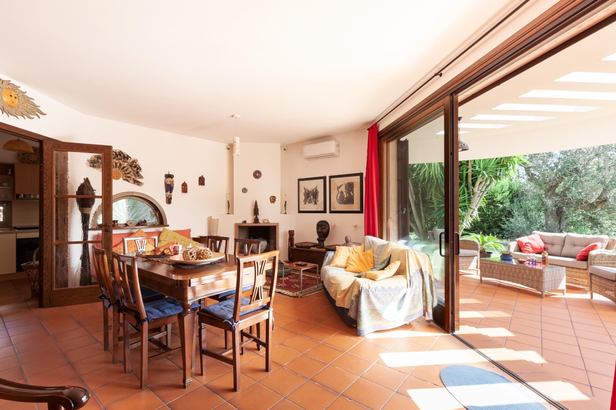 The contemporary house is spread over 2 floors and encourages outdoor living, with glass doors leading from the living area out onto various shaded terraces. The spacious living room has large glass doors onto the exterior seating area. Back inside there is a sofa, armchair, flatscreen TV, an open decorative fireplace and a dining table. Double doors lead to a large kitchen. The kitchen is well-equipped with a cooker hob, oven,fridge/freezer and Mokka coffee machine. A door from the kitchen leads out to the dining area on the terrace.