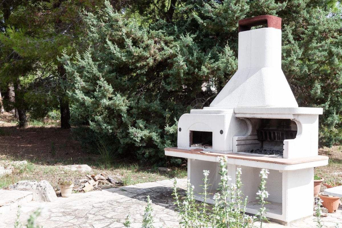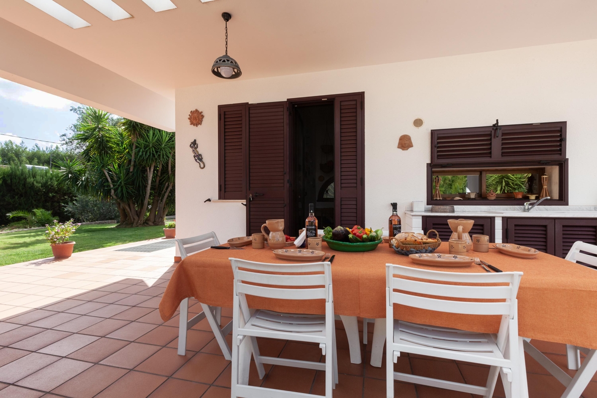 A deep veranda runs around the side of the house providing shade for the attractive seating area, furnished with a sofa, armchairs and coffee table for relaxed drinks. The dining area has a large table and chairs as well as a stone BBQ, pizza oven, side unit and sink, for easy meals al fresco.