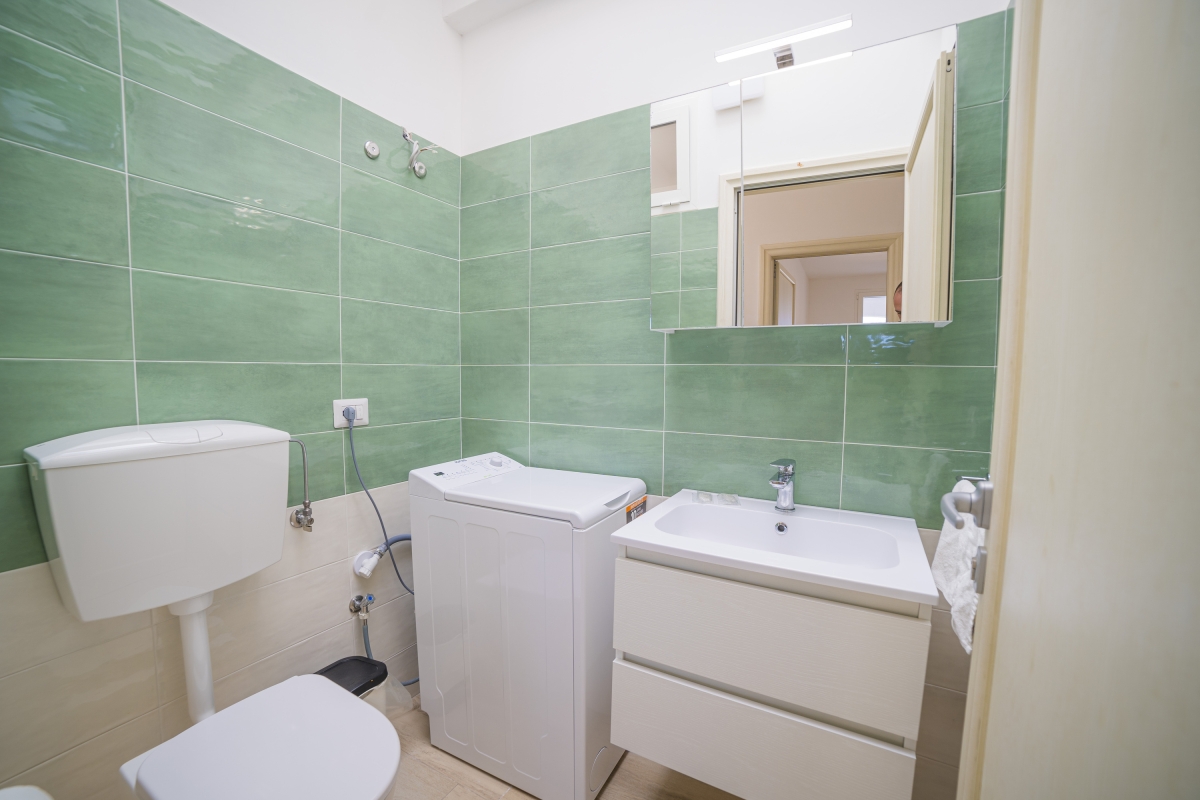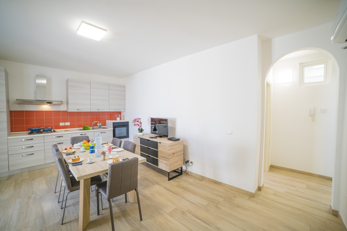 The bright living room is furnished with a contemporary sofa, a flat-screen TV, a dining table and chairs. The open-plan kitchen is well-equipped with a cooker hob, oven, fridge/freezer and coffee machine. Glass doors open out from the living space onto a lovely arched loggia which runs along the side of the apartment. This provides shade on the hottest days. Beyond the loggia is a spacious terrace which is an extension of the apartment. It is furnished with a dining table and BBQ for delicious meals al fresco, looking out towards the sea. There are also sun loungers where guests can relax.