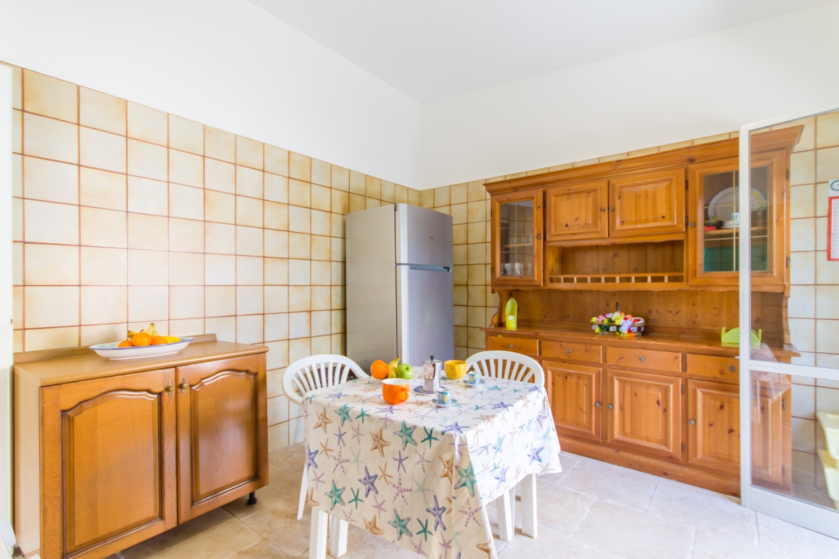 The villa has two entrances, one via a side gate and the other via the driveway. The front entrance, from the driveway, leads directly into the living room. This is furnished with a sofa, armchair, flat-screen TV, dining table and chairs. The newly fitted-out kitchen is at the back of the villa and is equipped with a cooker hob, oven, fridge/freezer and coffee machine. There is a small kitchen table and chairs for quick snacks. A door leads from the kitchen to the side terrace, which can be shaded. There is a large table and chairs, ideal for meals al fresco.
