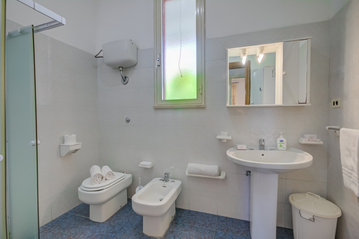 The front of the villa is dominated by a spacious veranda which looks out over the garden. It is the ideal spot to relax or enjoy meals al fresco at the dining table. Double glass doors take you into the living room which is furnished with 2 sofas, an armchair and a smaller dining table and chairs. The separate kitchen is off the living room. It is equipped with a cooker hob, oven, fridge/freezer. There is also a kitchen table for casual dining.