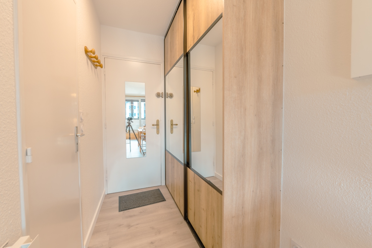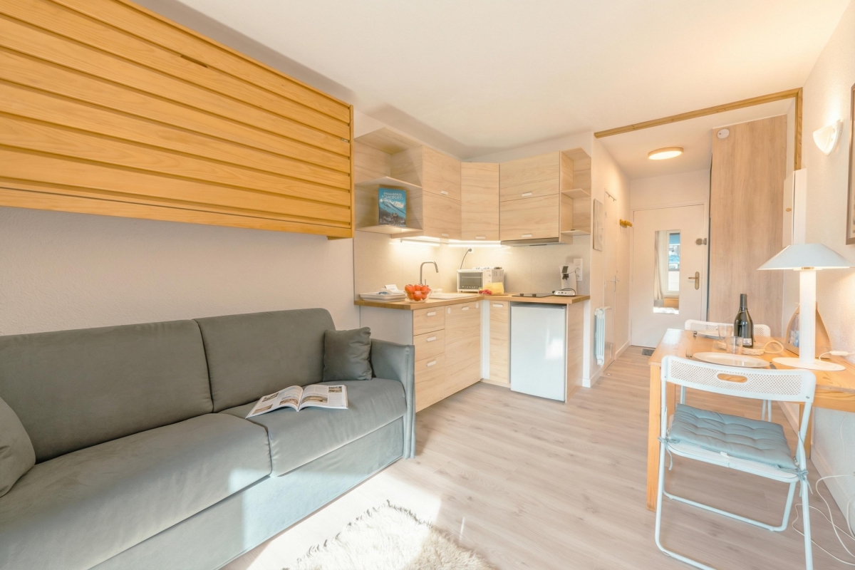 On the first floor of a new residence, with stylish décor and wooden flooring throughout, this studio sleeps 2 people. The airy living room has a glass door that leads out onto a private balcony, with a table and chairs, where guests can sit and enjoy the view over the square to the mountains beyond. In the living room, there is a sofa, a Smart TV and a dining table for 2. The kitchenette is equipped with an cooker hob, microwave, nespresso coffee machine and fridge/freezer.
