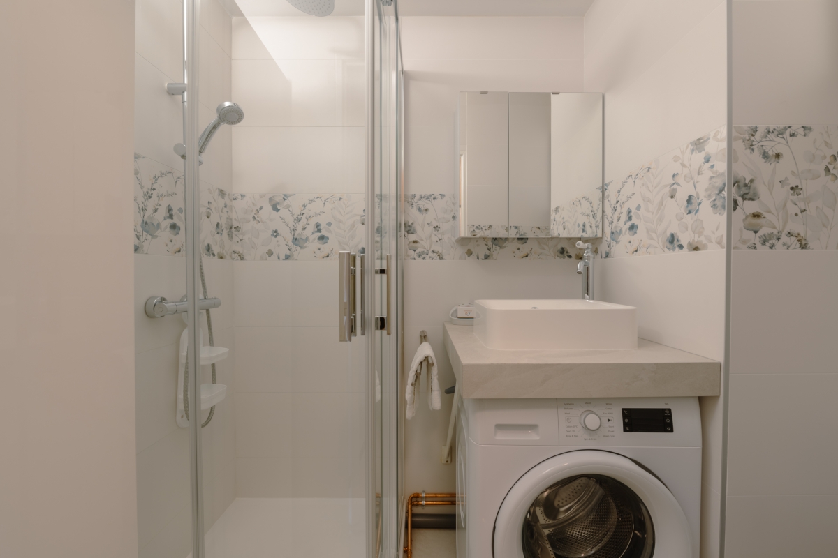 The neat bathroom has a shower, basin, W.C. and washing machine.