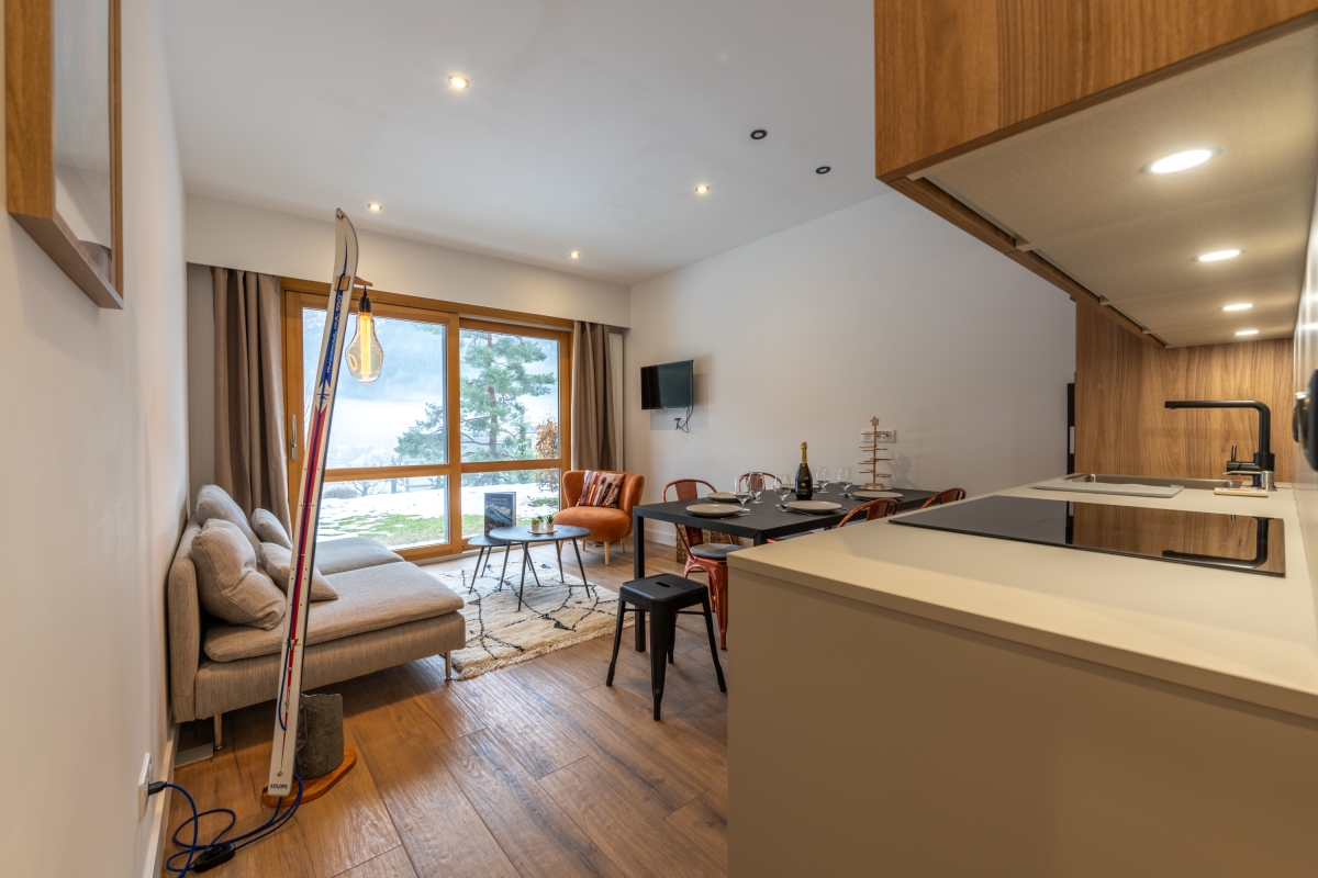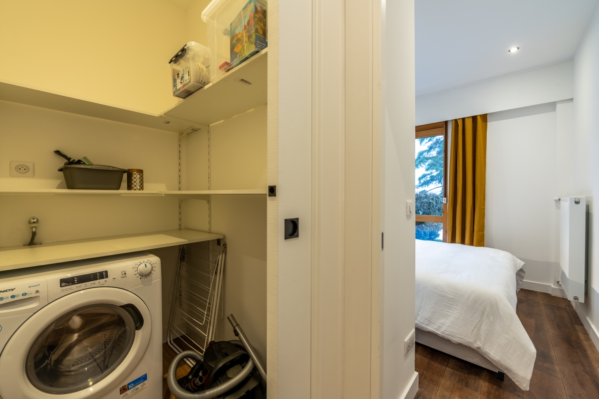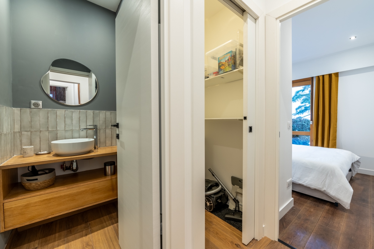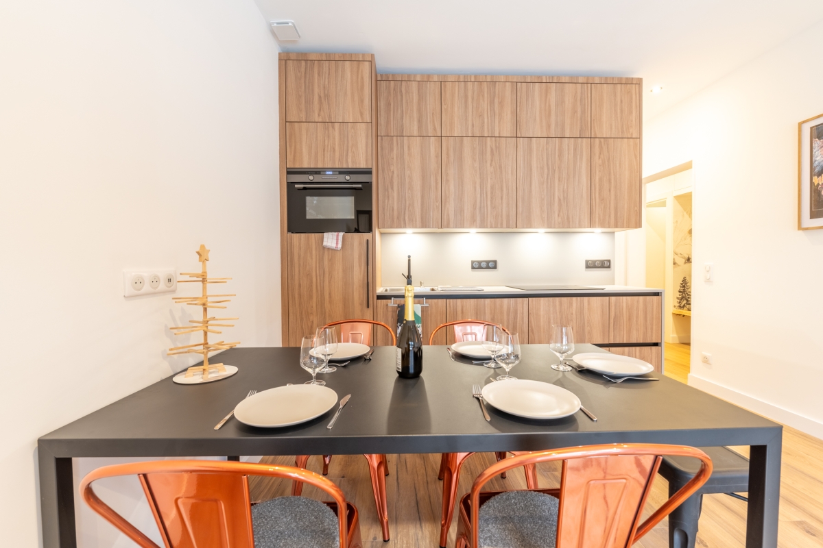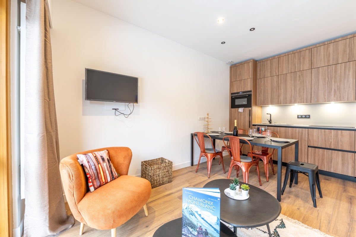 The apartment, which sleeps 5 people, is in a modern residence, on a quiet street, just a few minutes walk from the centre of Chamonix. The living area is full of light, thanks to glass sliding doors which lead out to the garden and uninterrupted views of the mountains beyond. The spacious room is furnished with a sofa, armchair, a flat-screen TV and a dining table for five. Next to this is the kitchen which has been beautifully fitted out and is equipped with a combined cooker/induction hob, oven, microwave, fridge/freezer, dishwasher and drip coffee machine.
