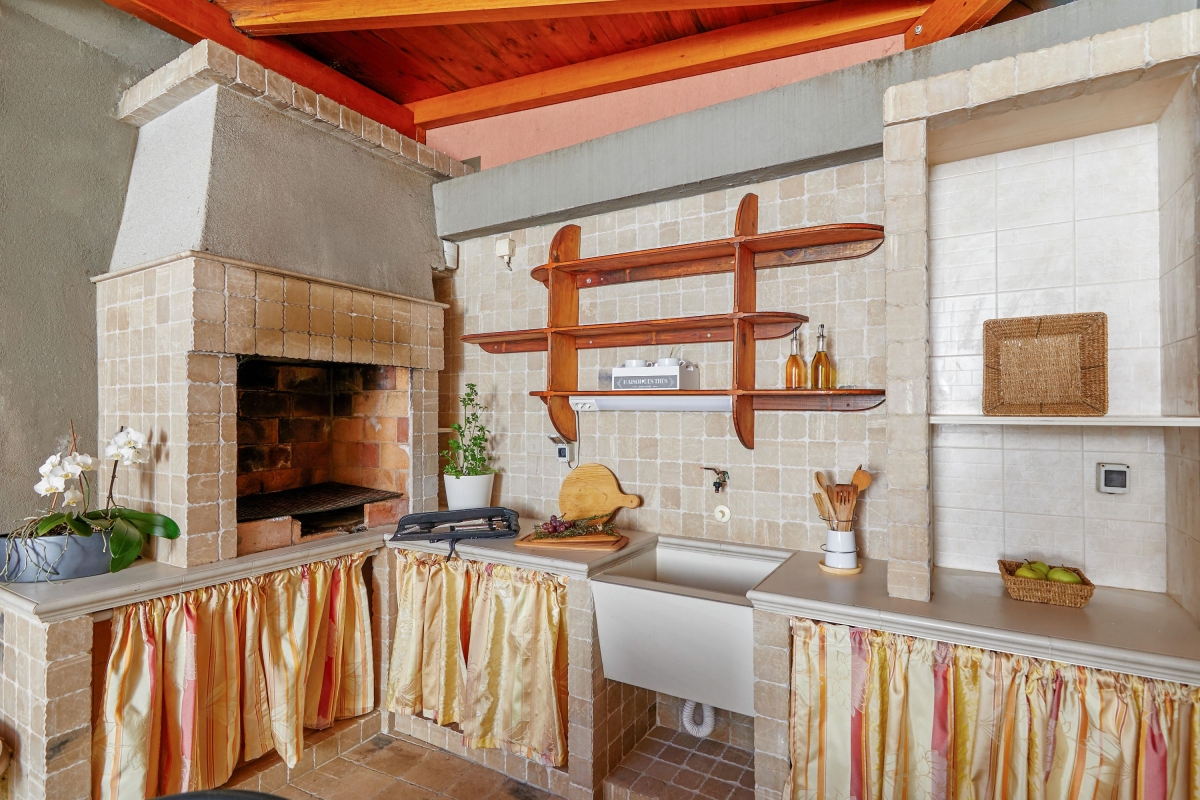 Inside, the bright and airy property enjoys multiple living spaces where guests can unwind. These include an eat-in kitchen, two dining areas (one with a small kitchenette) and a comfortable TV room that leads out to the balcony through a double set of French doors. The main kitchen has been beautifully finished with a breakfast bar for three, a cooker hob, an oven, a microwave, a drip coffee machine, a dishwasher and a fridge freezer. The property has been lovingly finished with well-chosen antiquities, artwork and furniture, including flat-screen digital HDTVs in the living spaces and bedrooms, comfortable seating areas, a fitness room and a sauna.