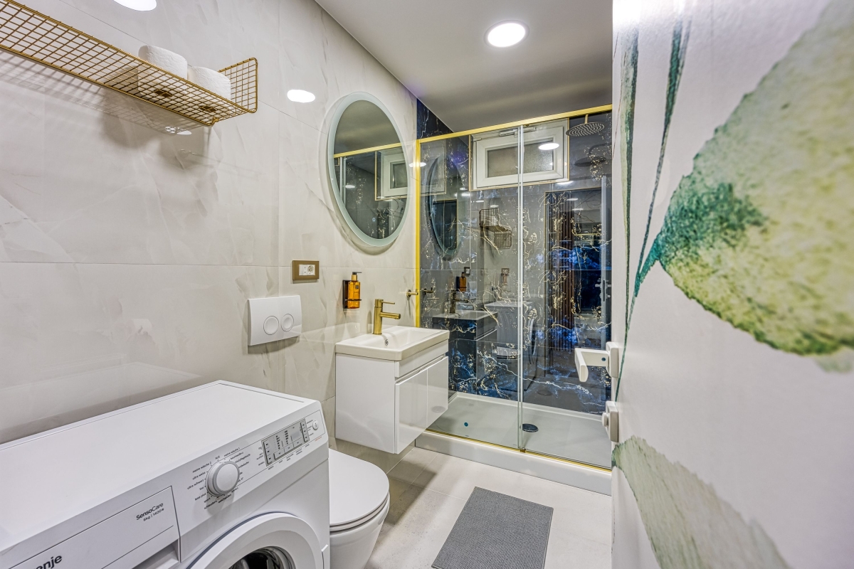Bathroom: The modern bathroom is fitted with a shower, a washbasin and a WC
