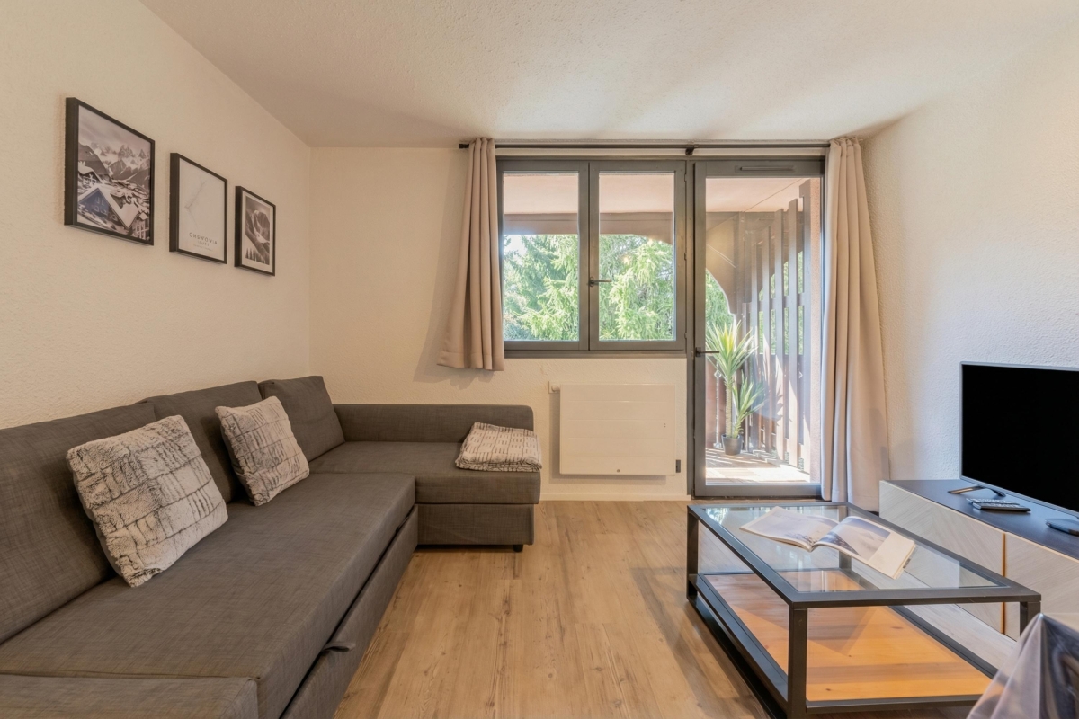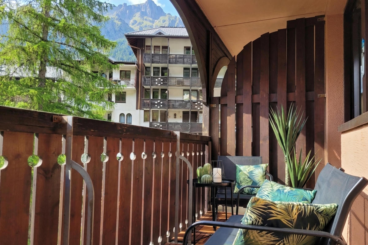 A contemporary apartment in southern Chamonix, which looks out over trees to the mountains beyond. This 2nd floor apartment (with lift) sleeps 6 people and makes an ideal holiday base, at any time of year.
