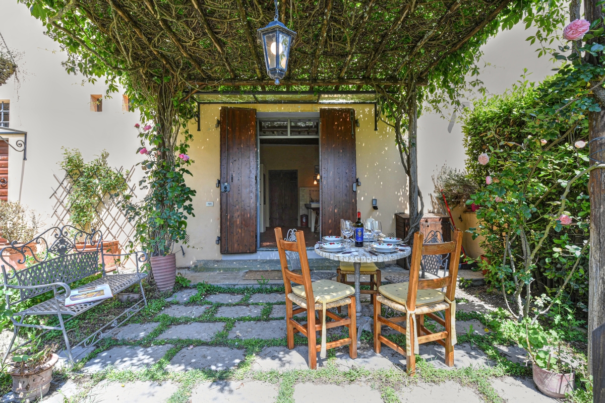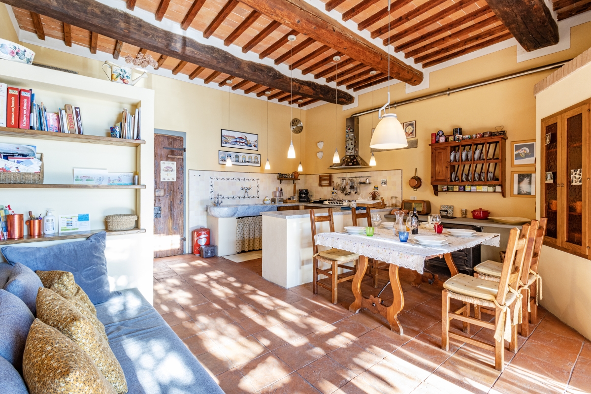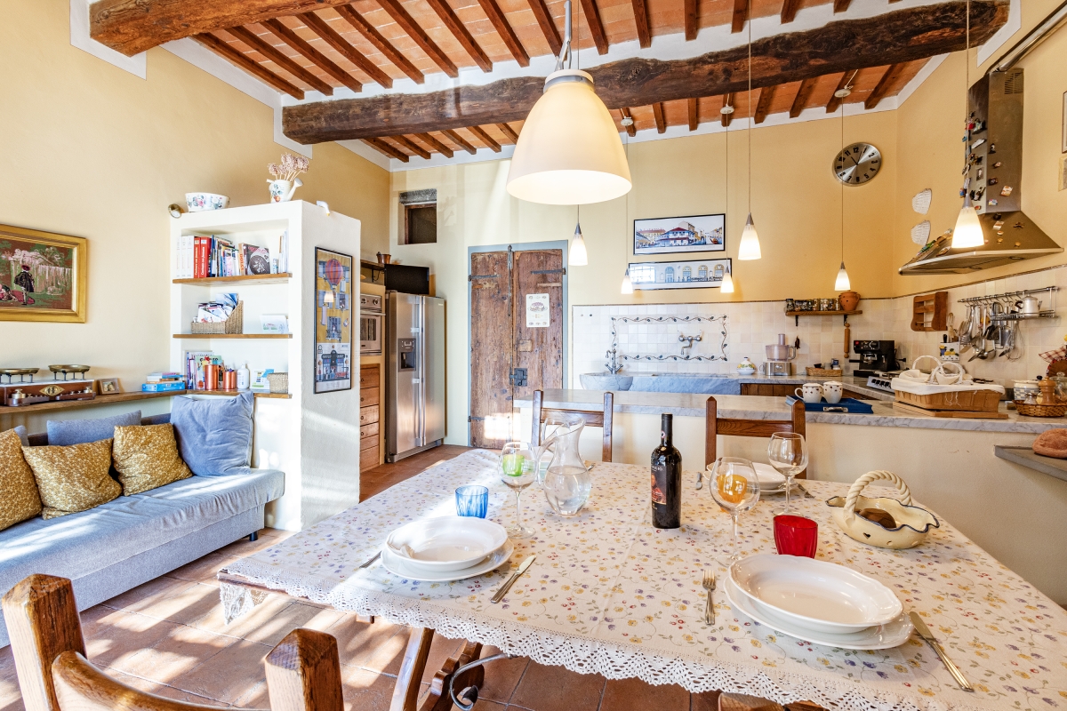 Quietly situated on a sunny hillside in the heart of the Chianti wine route this charming, semi-detached holiday home is arranged over two floors and benefits from its private outdoor terrace. Surrounded by trees and a beautiful view of the surrounding area the house has been carefully renovated and lovingly finished in a typical Tuscan style, with terracotta floors and original wood-beamed ceilings.