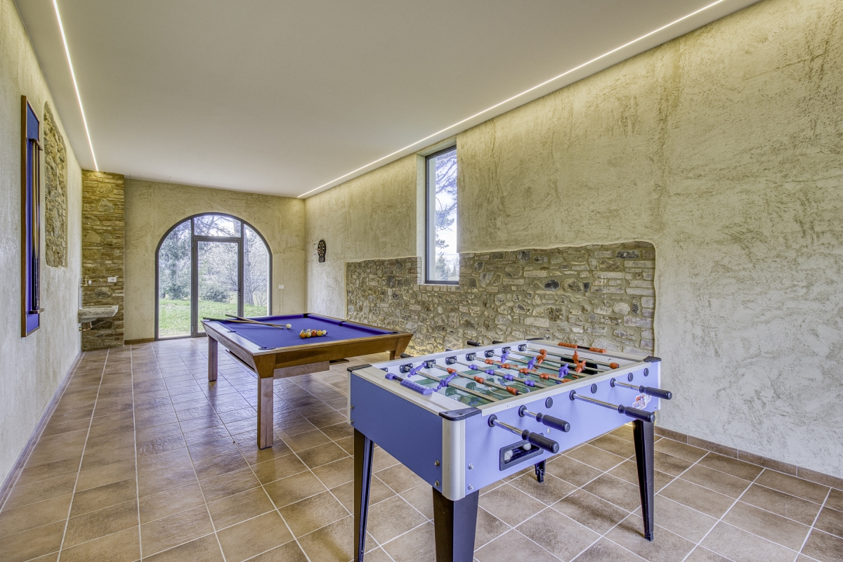 In addition, on the ground floor, there is a games room, a common space that can be shared to spend moments of joy and serenity. Inside, guests will find a billiard table with holes and cues, a foosball table and a dartboard for playing darts. This area can be accessed via two separate doors and guests will be provided with keys. Please note that as it is a communal area, if the other flat is rented, other guests will also have access to it.