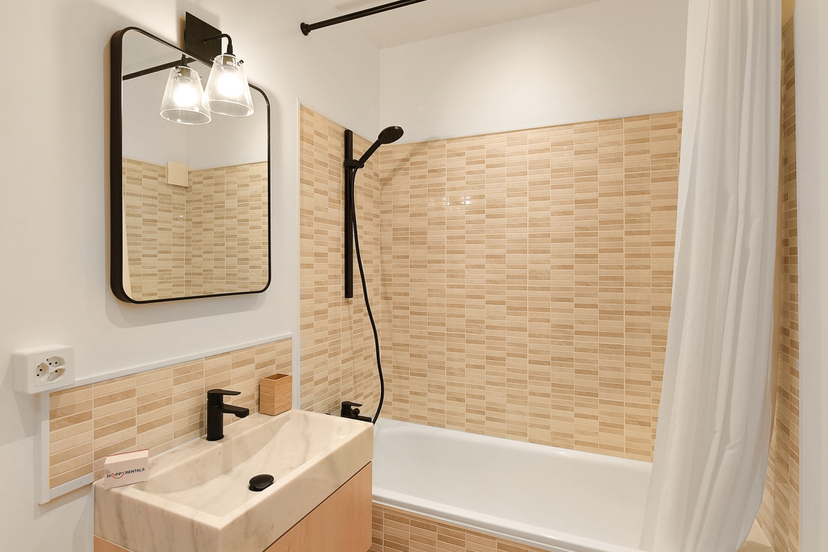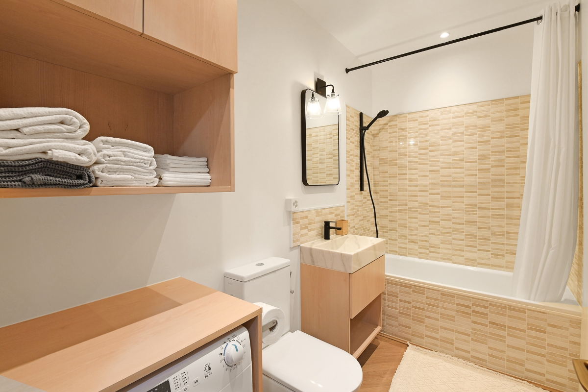 Bathroom 1: The modern bathroom has a bathtub with shower, washing machine and WC.