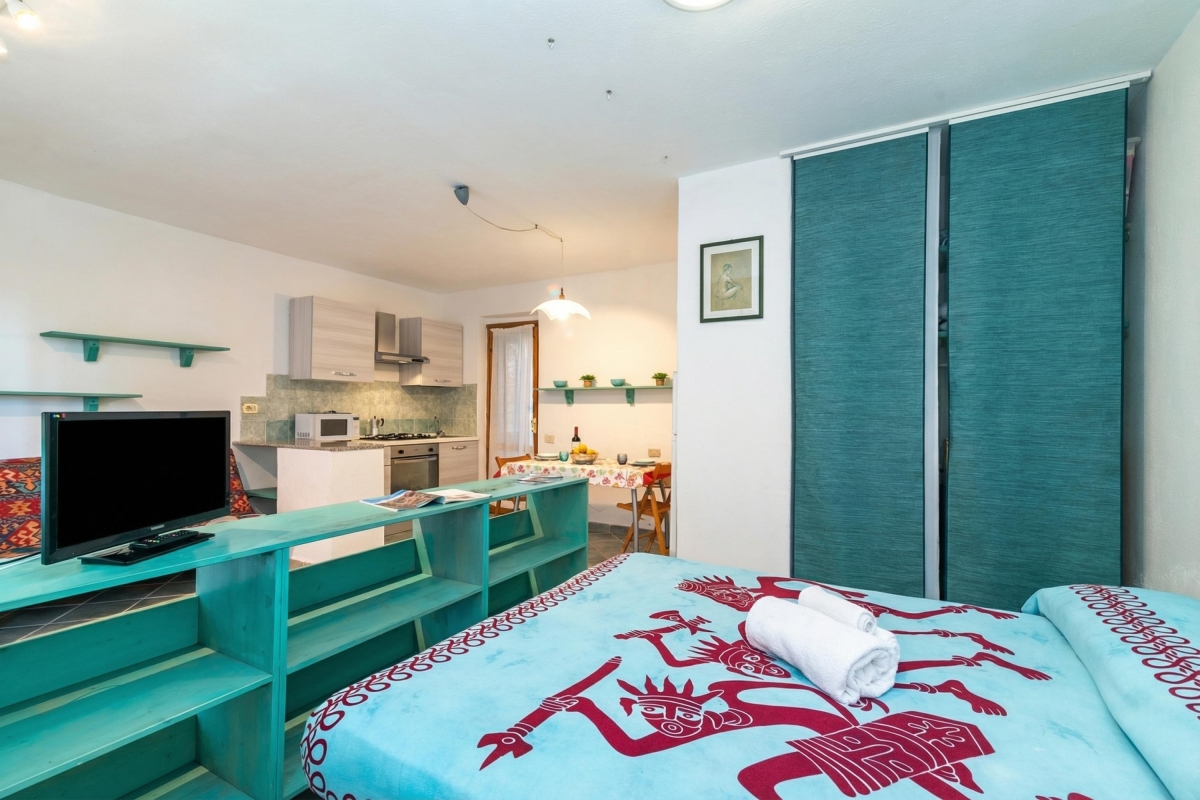 The ground-floor apartment is on a paved lane which leads directly to the beach. Guests can access the property via a charming front terrace which is furnished with a table and chairs, ideal for morning coffee or a glass of wine. Double glass doors lead into the open-plan studio.
