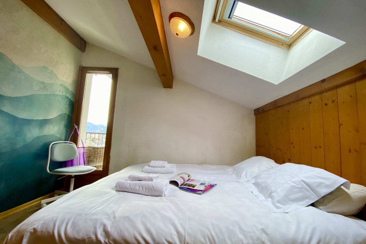 Located on the third floor of a chalet-style residence, this spacious apartment features a large terrace offering breathtaking views of the mountains. There is a fully equipped open kitchen with a hob, microwave, refrigerator, dishwasher, toaster, raclette set, and coffee machines (Nespresso and classic). Next to the kitchen is a lovely dining table that can seat 4 people. The apartment offers a dedicated workspace with a desk, ideal for remote working.