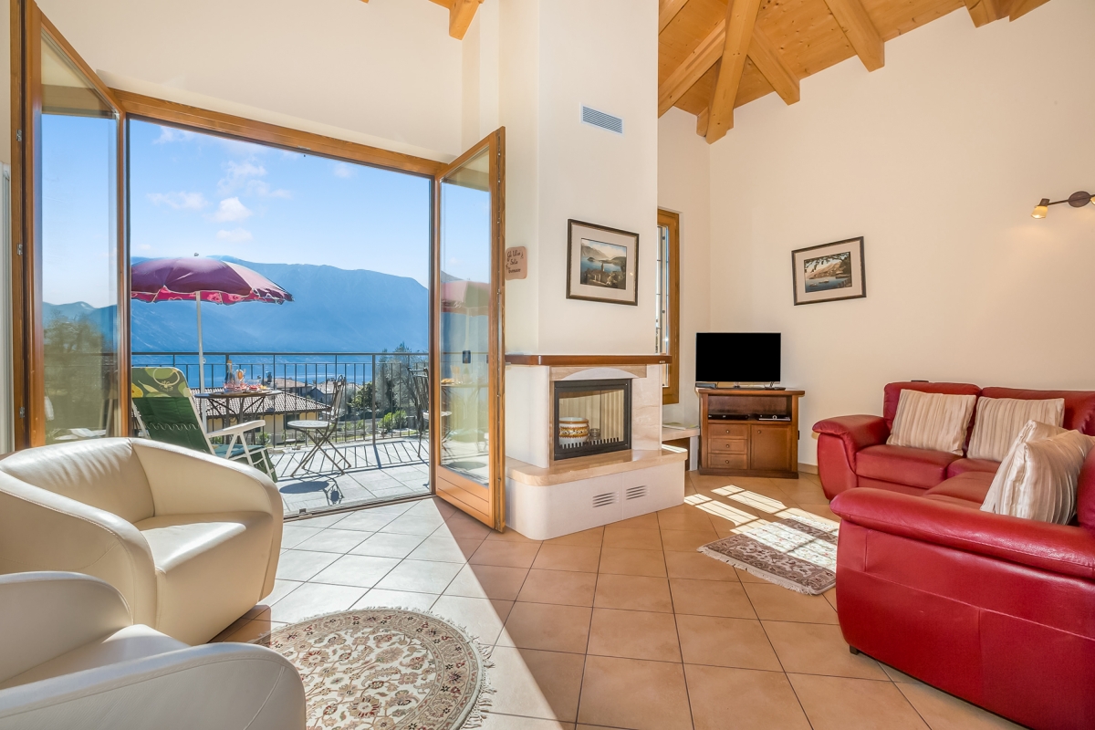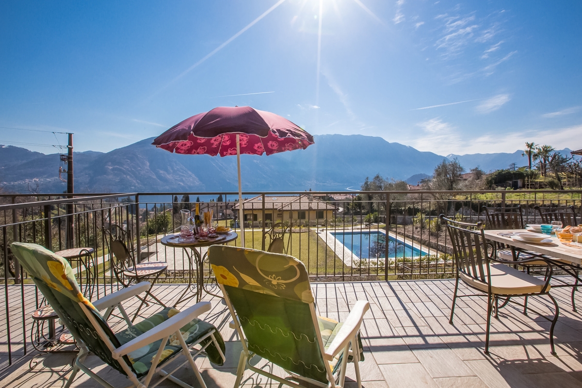 From the first floor duplex apartment guests can easily reach the communal landscaped garden which boasts a shared outdoor swimming pool and sunny panoramic lake views.