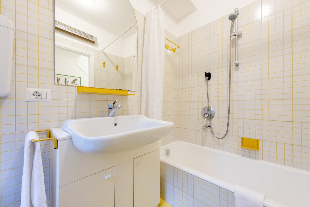 The bright and airy living space enjoys a large picture window overlooking the Piazzetta and is furnished with a comfortable sofa bed, two armchairs and a smart flatscreen TV. This area also incorporates the modern eat-in kitchen which is equipped with; an induction hob, an oven, a microwave, a coffee machine, a dishwasher, a fridge freezer and a large dining table. Guests can also dine alfresco in the property’s pretty courtyard garden the ideal place to cool down with a few drinks at the end of a busy day.