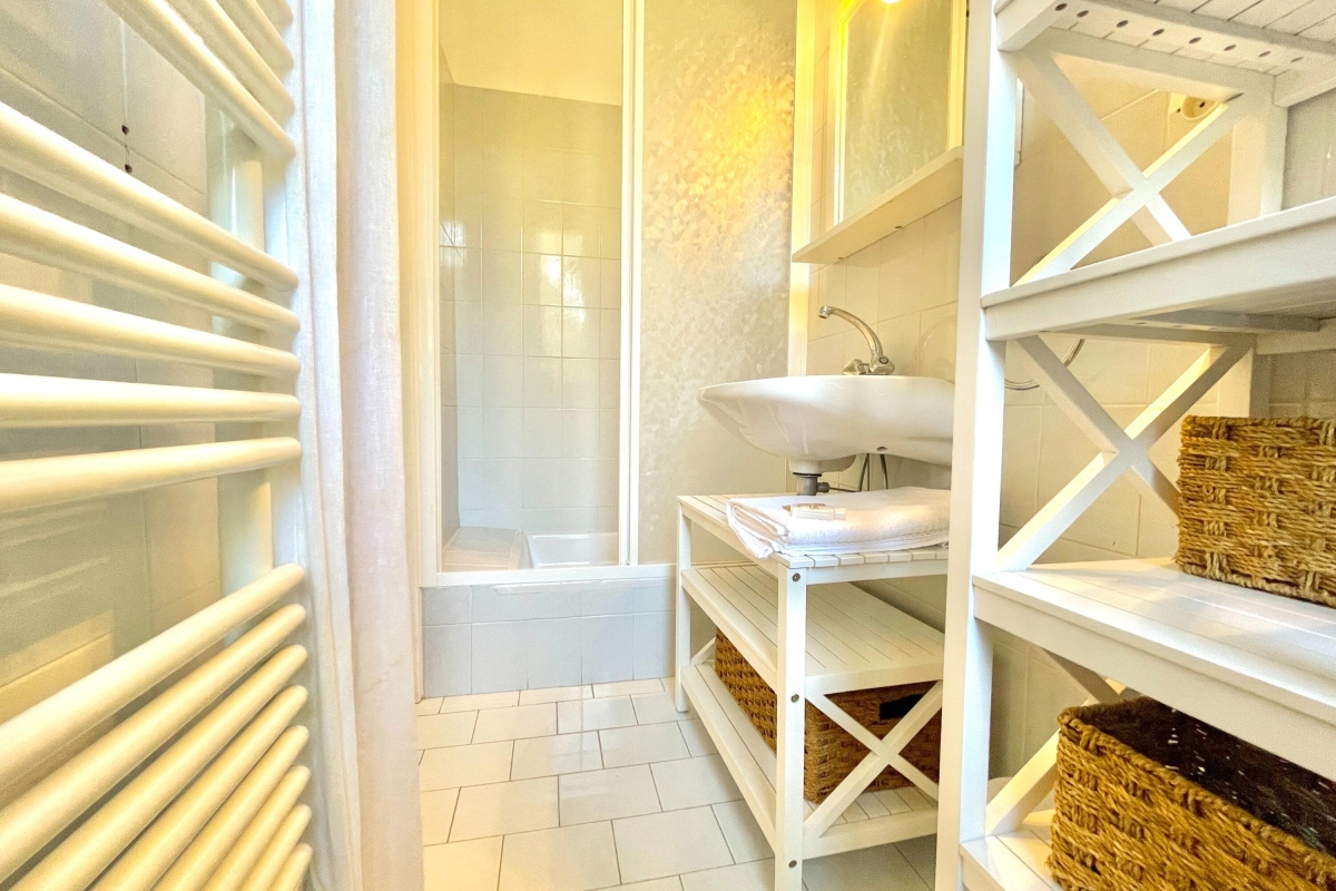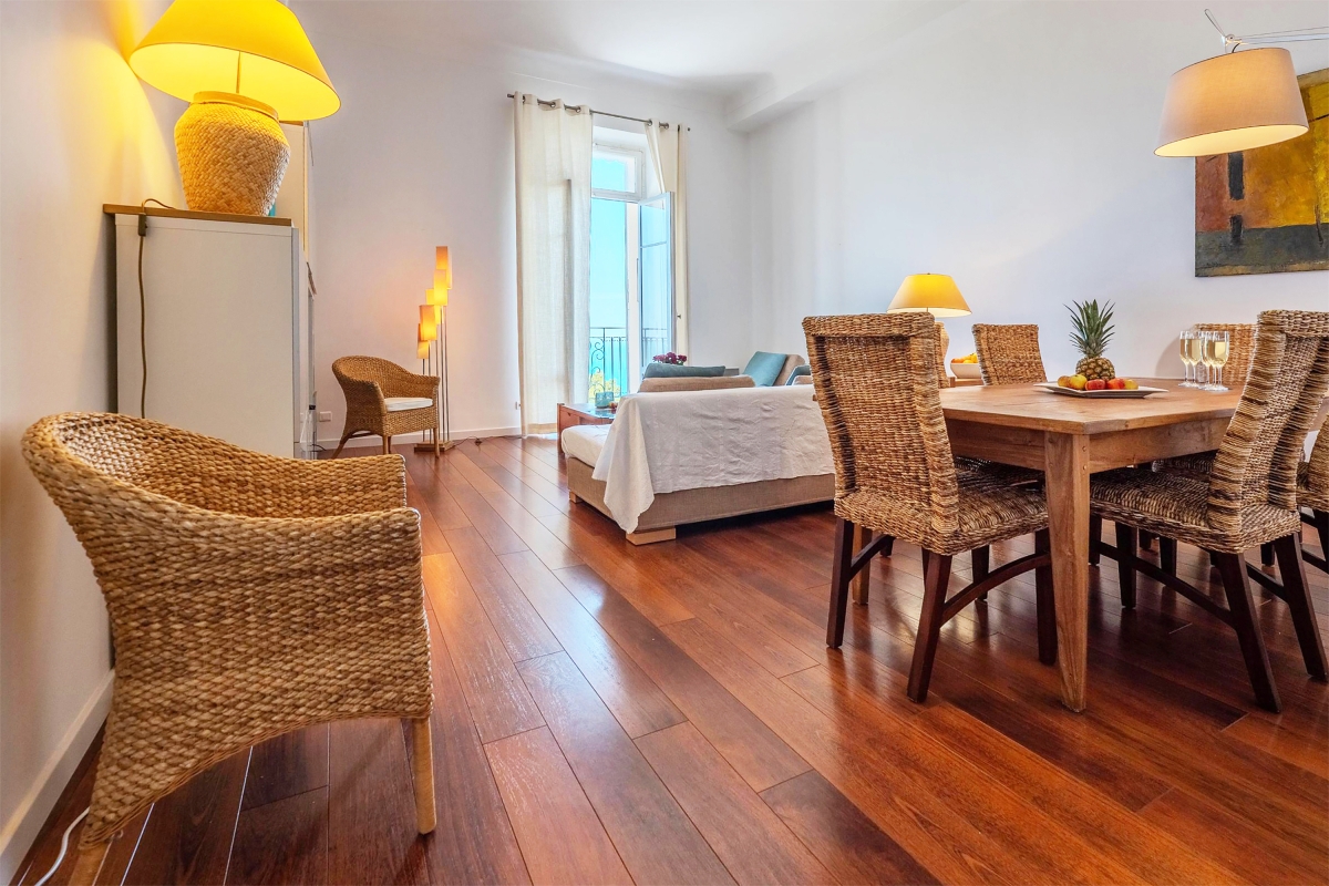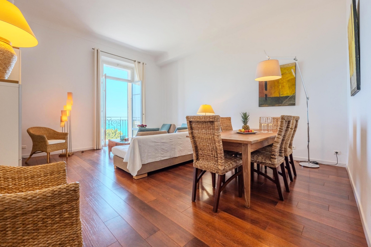 The apartment’s stylish interior features an elegant living/dining room with gorgeous wood flooring and panoramic sea views. The interior is stylishly modern with two sofas, a coffee table, a flat-screen TV and a dining table for 6. French doors open onto a balcony where guests can enjoy a morning coffee or an evening aperitif whilst looking out over the Mediterranean. The separate kitchen is well-equipped with a coffee machine, an induction hob, an oven, a microwave, a dishwasher and a fridge.