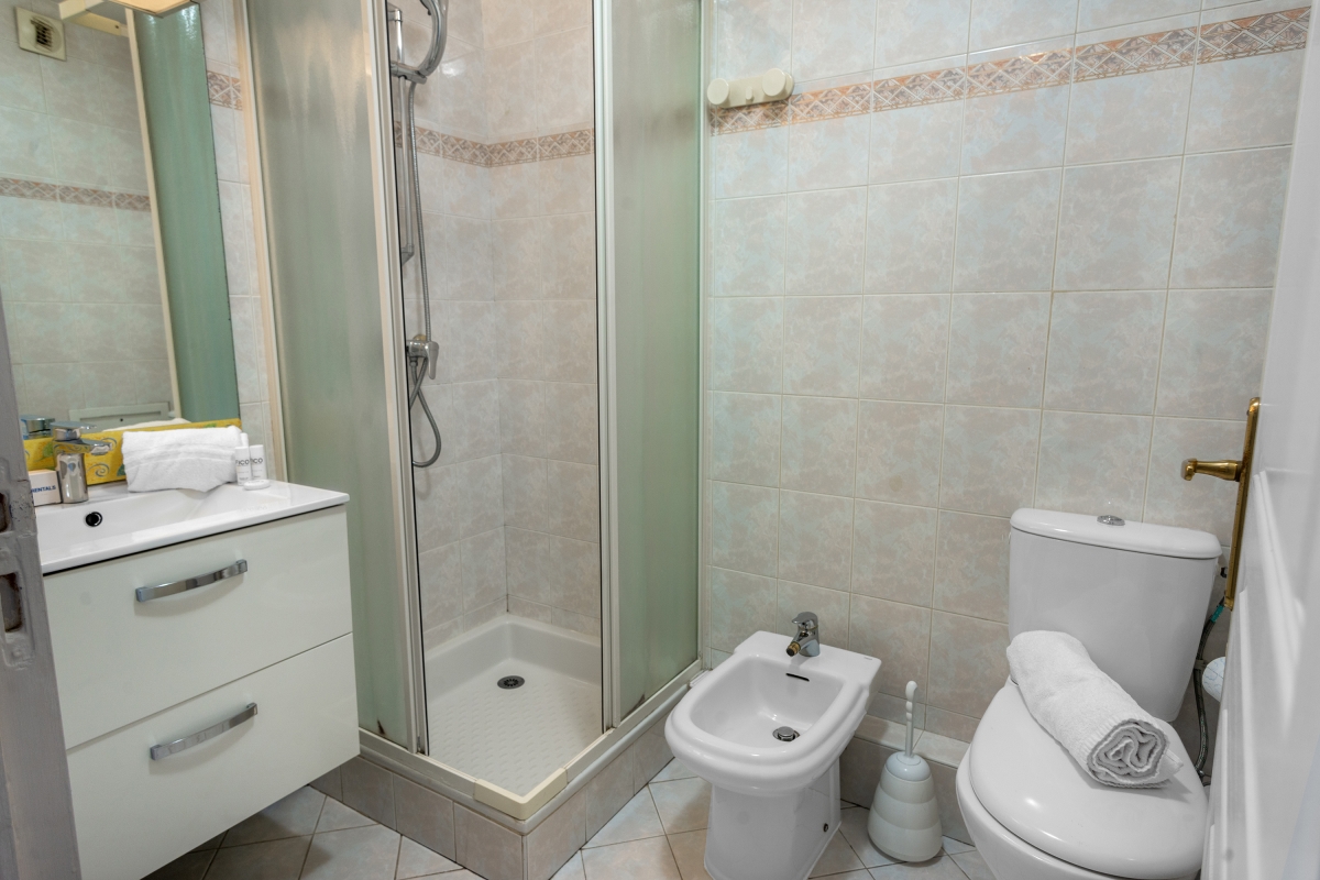 The elegant bathroom is equipped with a shower, basin, bidet and WC
