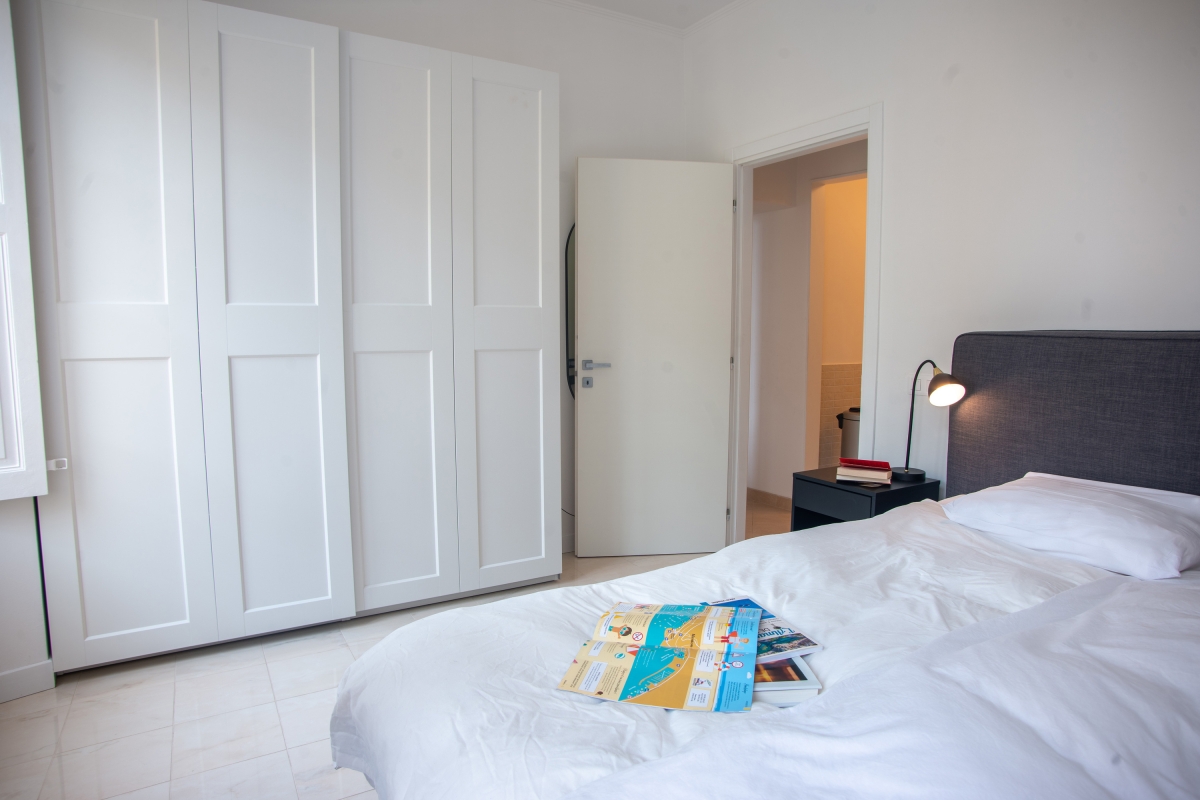 Inside, the apartment enjoys a large living room furnished with a comfortable L-shaped sofa and a dining table, and air conditioning. Large picture windows flood the rooms with natural light. The modern kitchen opens onto a small balcony and is equipped with, a cooker hob, an oven, a microwave, a dishwasher, a coffee machine and a fridge.