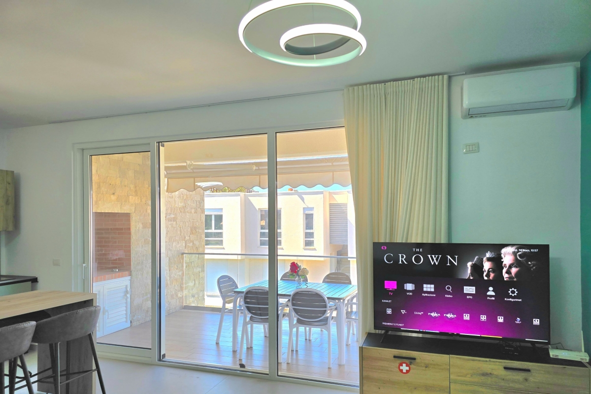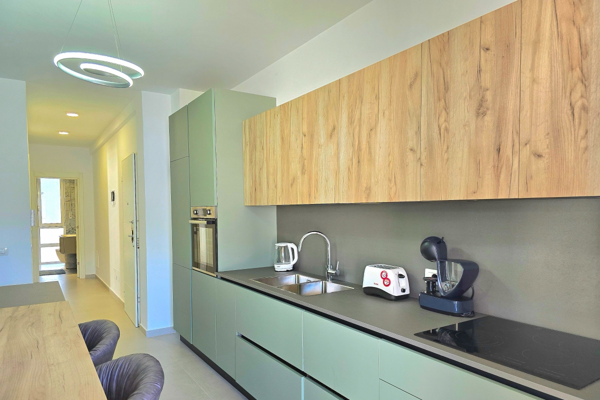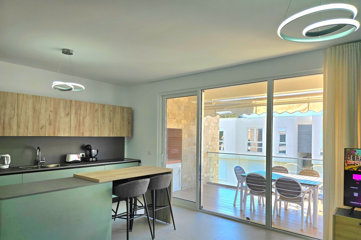 The property’s contemporary décor creates a relaxed but stylish atmosphere. The open-plan living area is full of light thanks to the large glass doors which lead out to the balcony. The seating area has a corner sofa, a flat-screen TV and a coffee table. The beautifully fitted kitchen is separated from the seating area by an island breakfast bar which seats 4 people. The immaculate kitchen is well-equipped with a cooker hob, oven, dishwasher and a fridge/freezer.