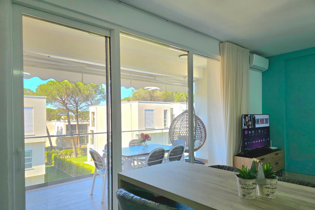 There is a partly shaded balcony which is an extension of the interior living space. It is furnished with a hanging cane chair plus a dining table and chairs for meals al fresco.