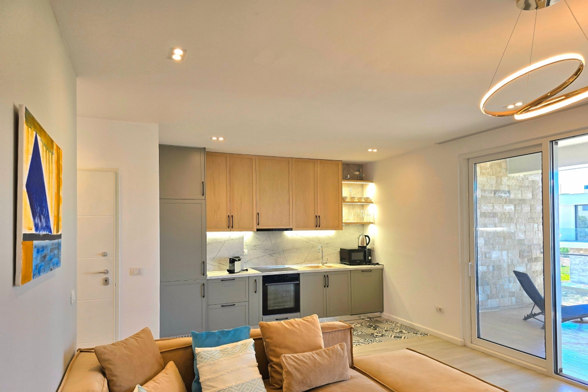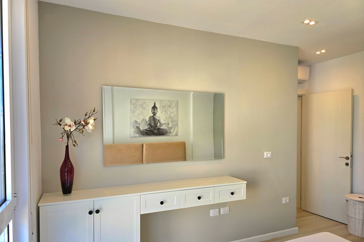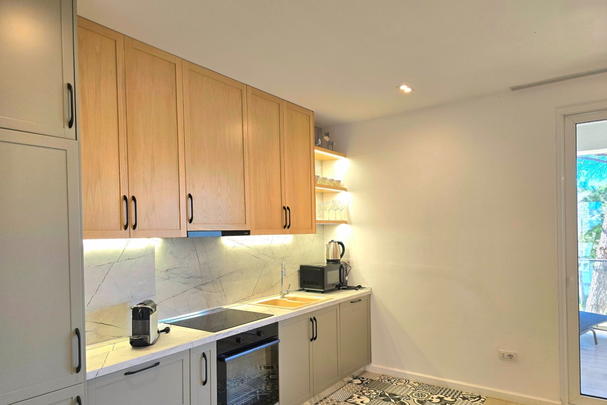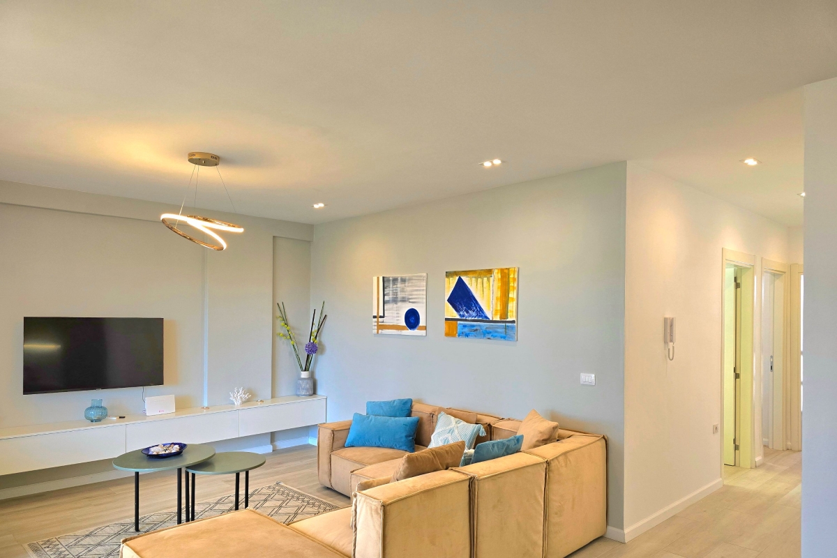 The apartment’s modern décor creates a relaxed but stylish atmosphere. The open-plan living area is full of light thanks to the large glass doors which lead out to a private balcony. The balcony is partly shaded and can be used as an extension of the interior living space. It is furnished with a dining table and chairs for meals al fresco.