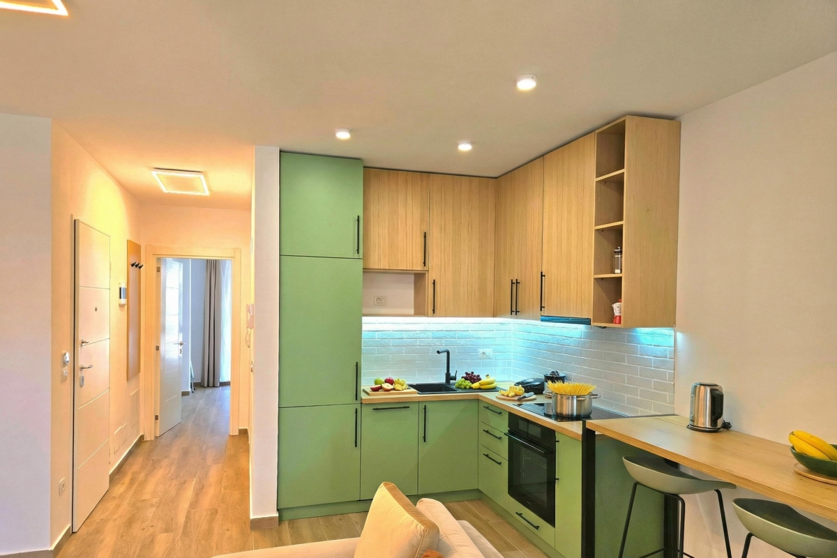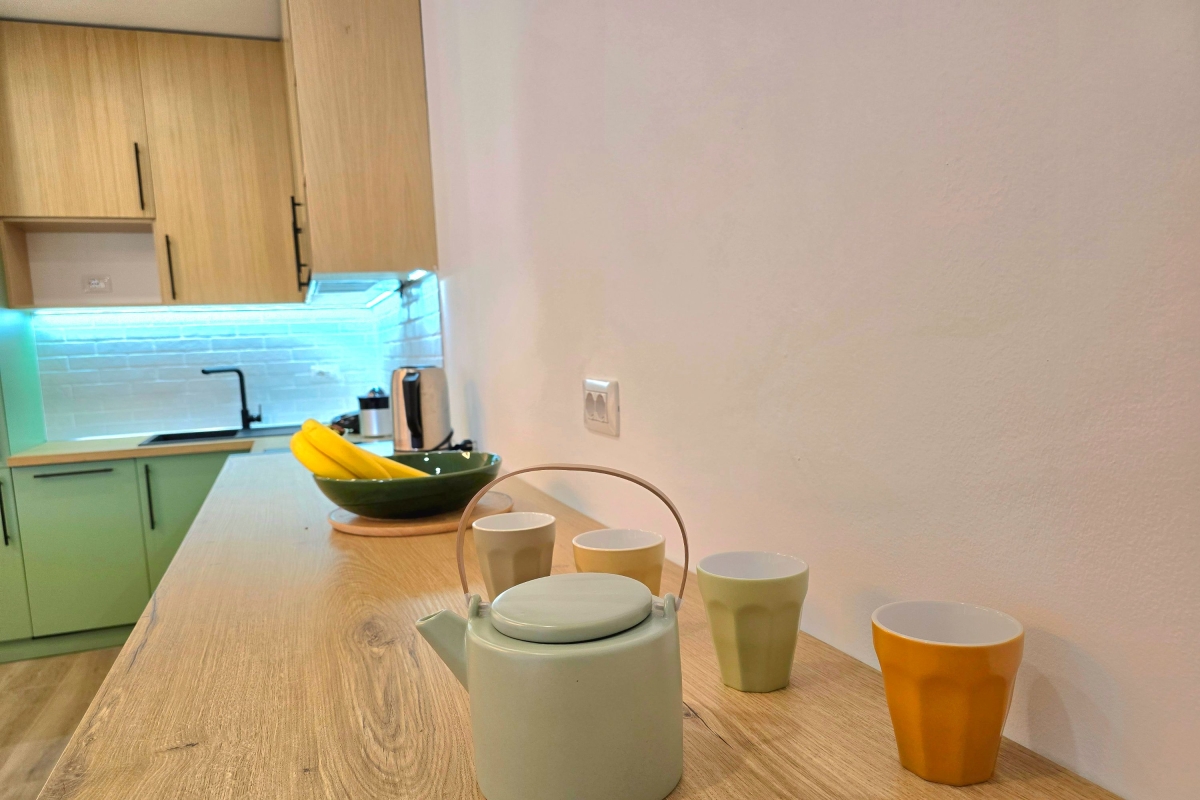 The apartment’s contemporary décor creates a stylish environment. The open-plan living area is full of light thanks to the large glass doors which lead out to a private balcony. The seating area has a comfortable sofa, a flat-screen TV and a high breakfast bar with four stools. The corner, fitted kitchen is well-equipped with a cooker hob, oven, coffee machine, dishwasher and fridge/freezer.