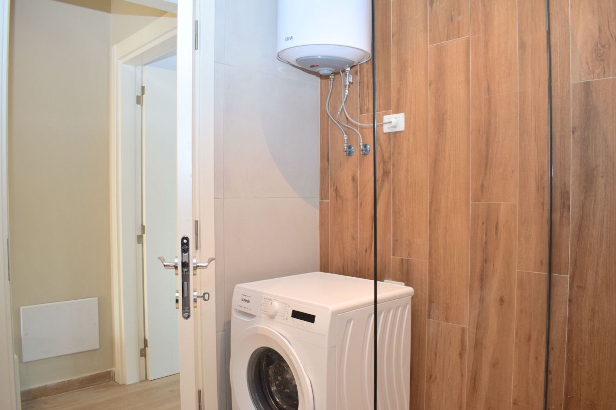 The sleek bathroom has a glass shower, basin, washing machine and WC.