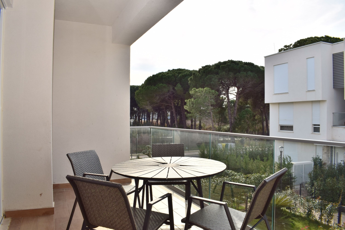 Glass doors open from the living room onto the shaded balcony. The balcony offers outdoor dining space for meals al fresco.
