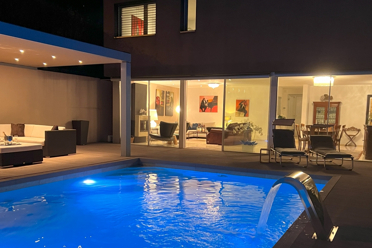 An architecturally stunning villa high on the hillside with lovely mountain and lake views. This residence, with a private outdoor pool, certainly lives up to its name, Villa Dolce Vita. It is an excellent place to relax in nature and enjoy the magnificent scenery around Lake Lugano.