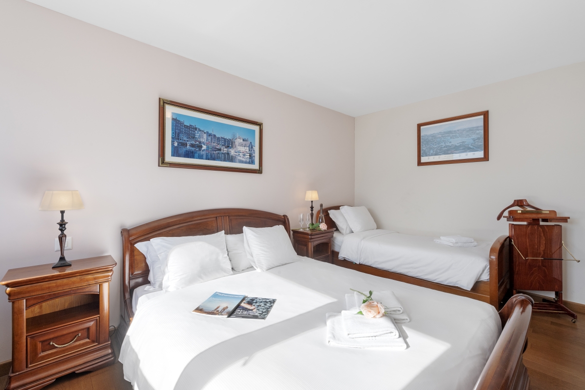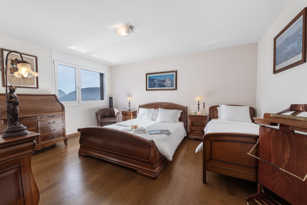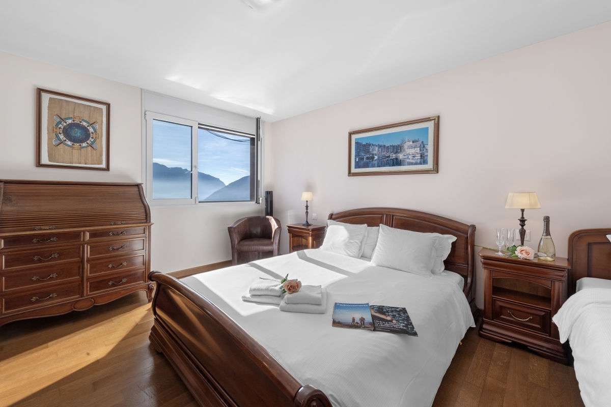 Bedroom 1: An airy bedroom looking out over the mountains, furnished with an elegant wooden double bed, an additional single bed and an en suite bathroom.