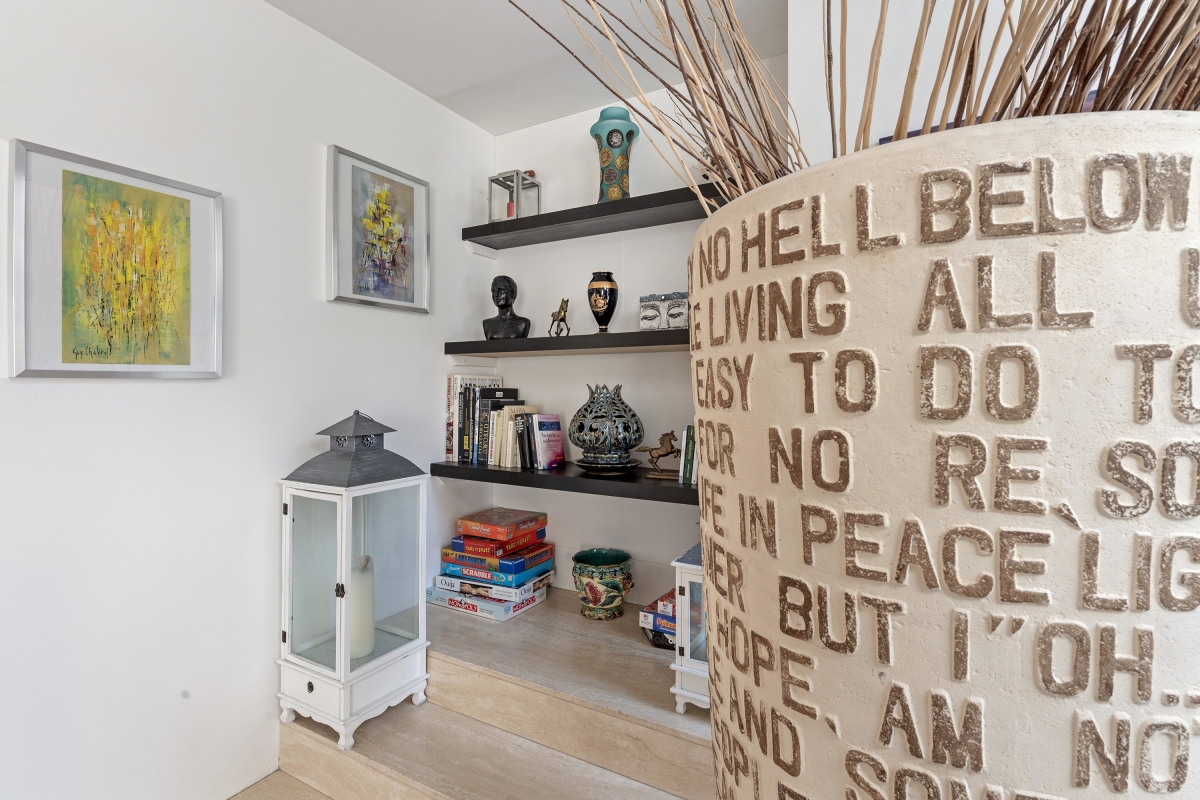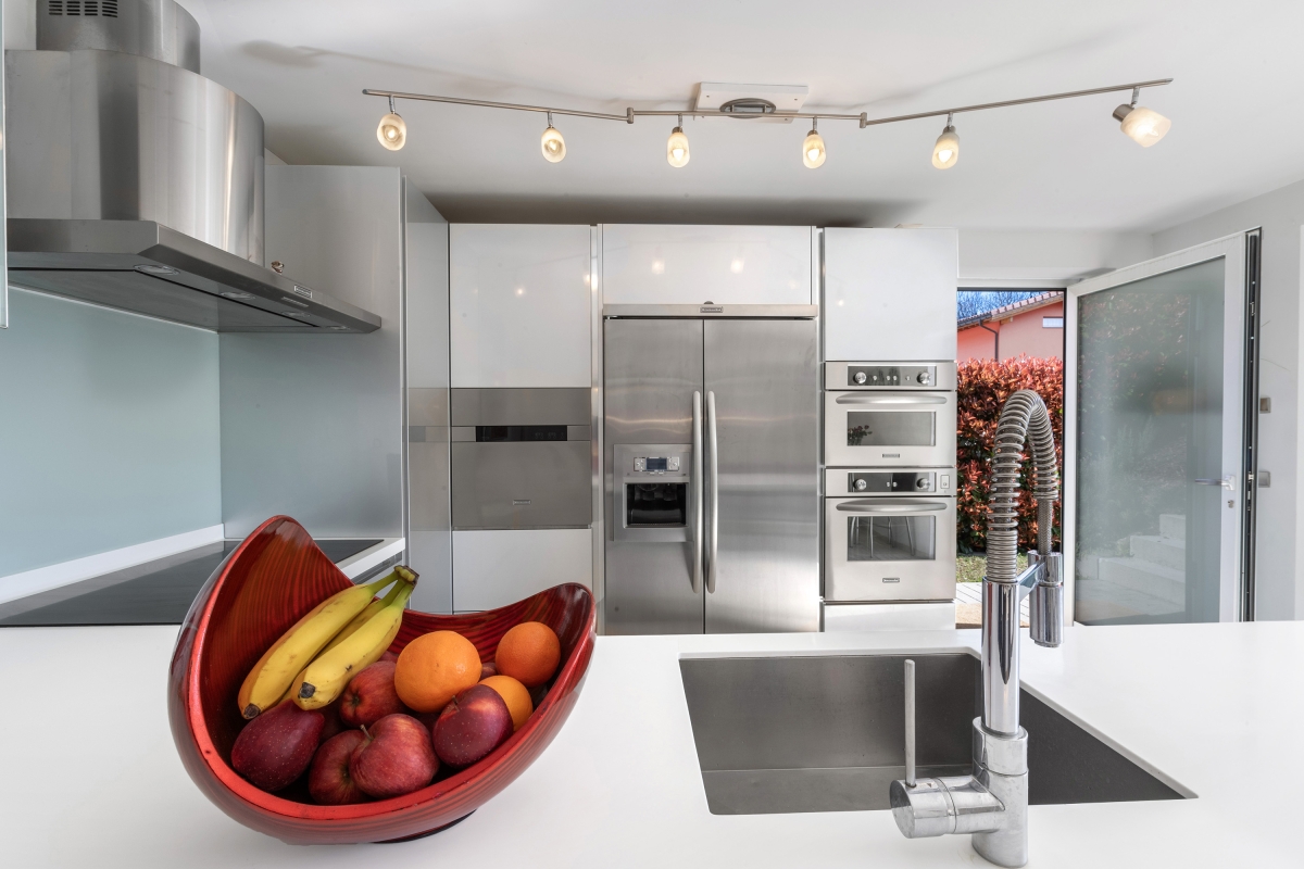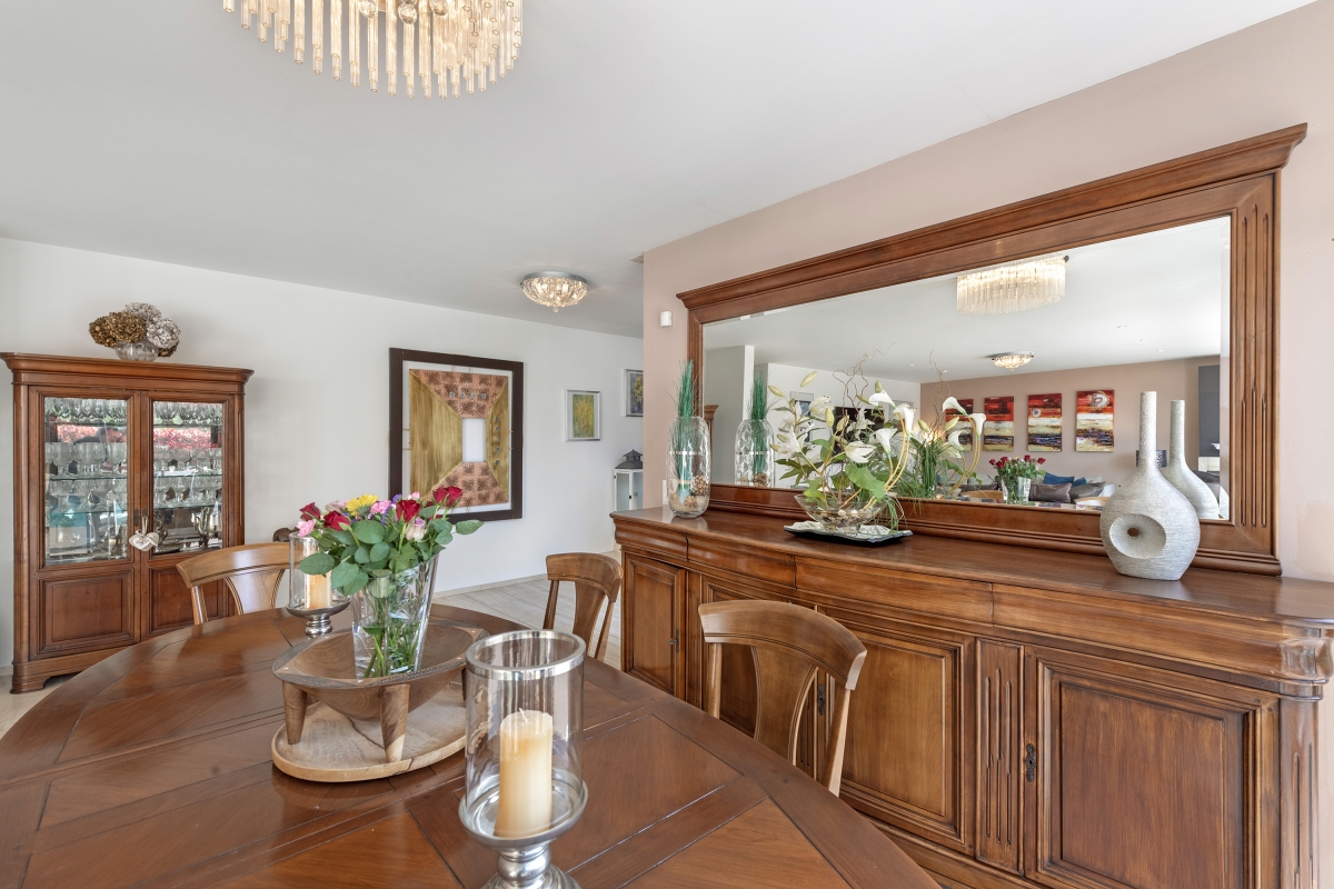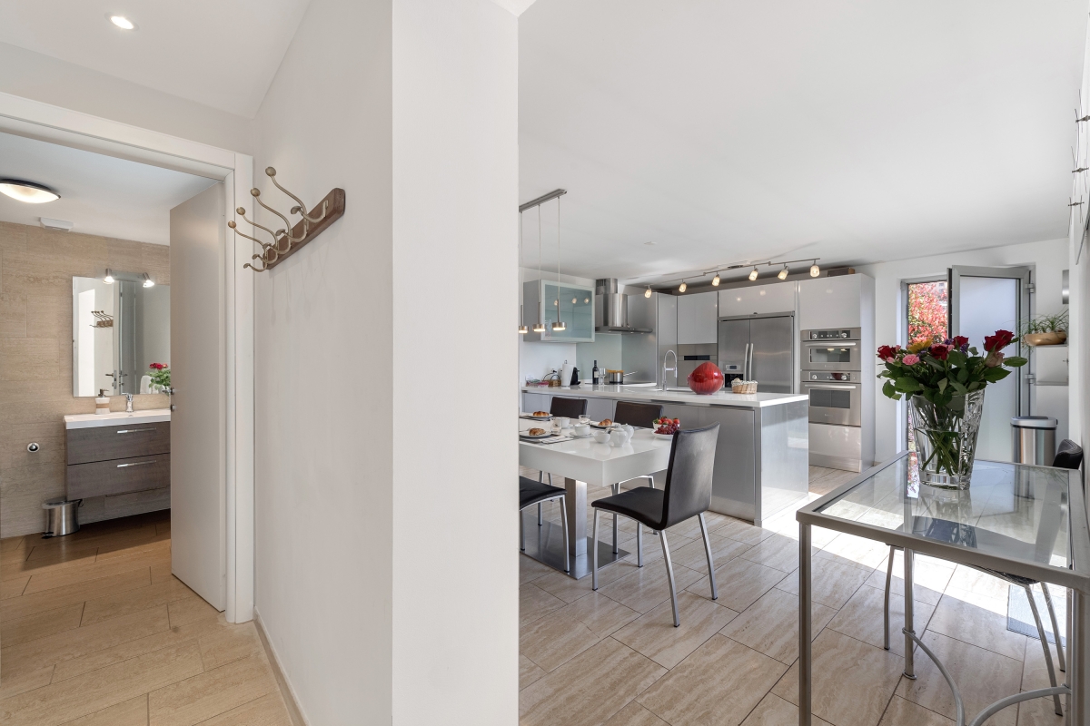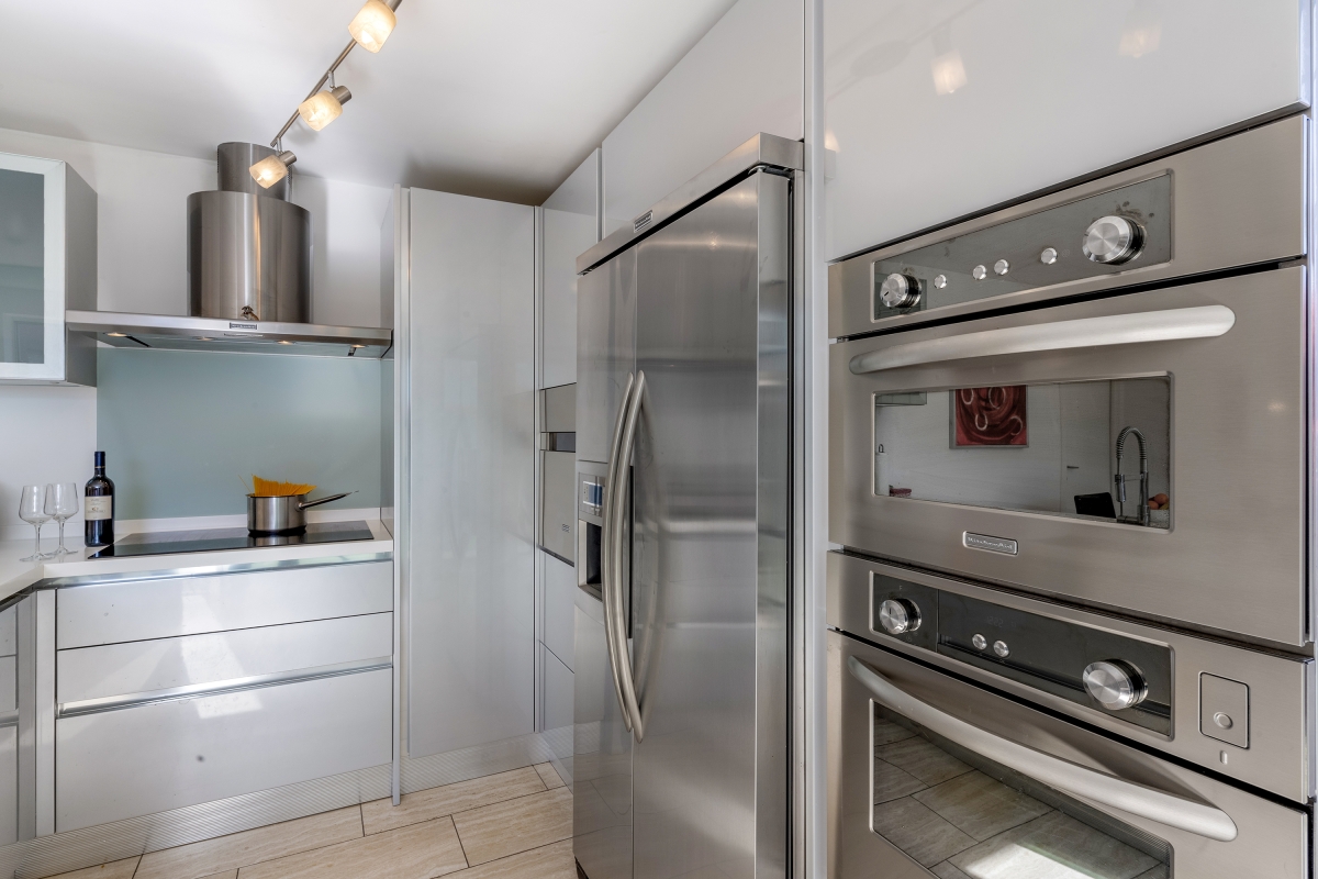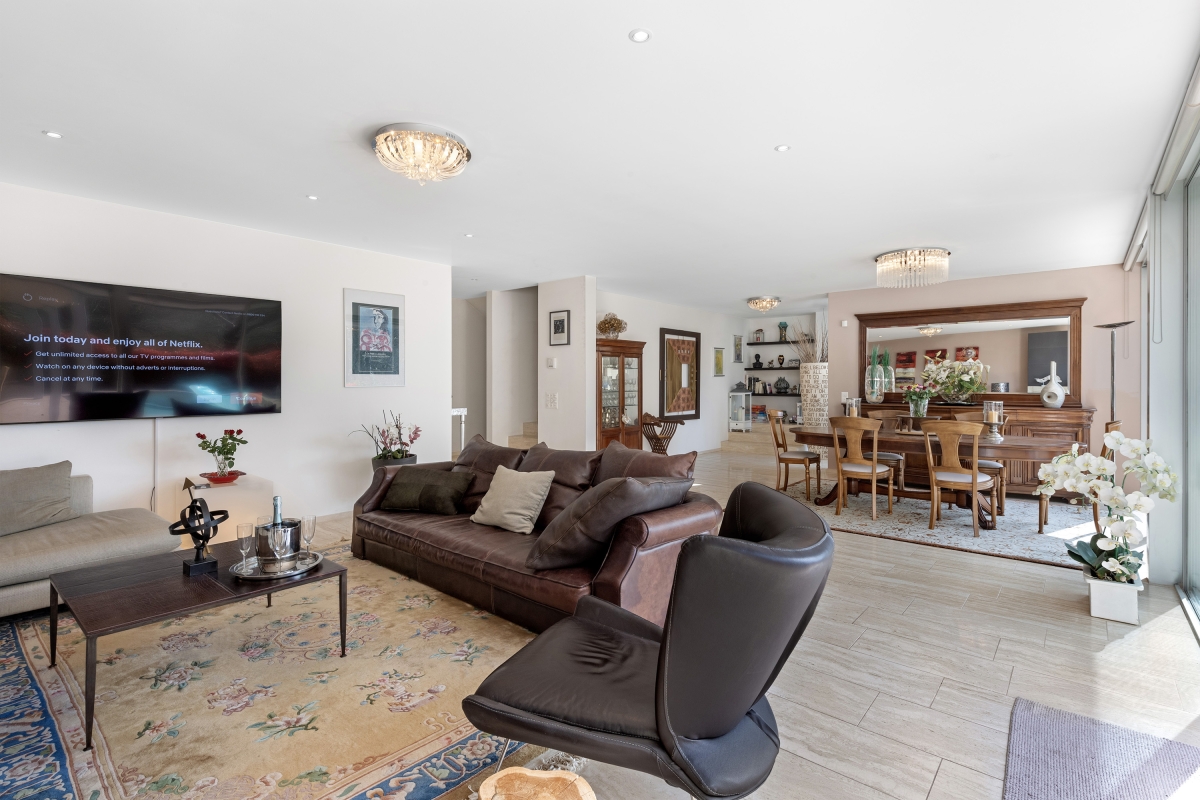 The ground floor consists of a spacious living/dining area. An entire wall is made up of large glass doors which open directly onto the swimming pool terrace. This light-filled room is furnished with two large sofas, chic armchairs and a wooden dining table. The separate, ultra-modern, fitted kitchen is fully equipped with an induction hob, oven, microwave, dishwasher, fridge, freezer. There is also a dining table in the kitchen for more casual meals. Large sliding glass doors open onto a separate lawn.