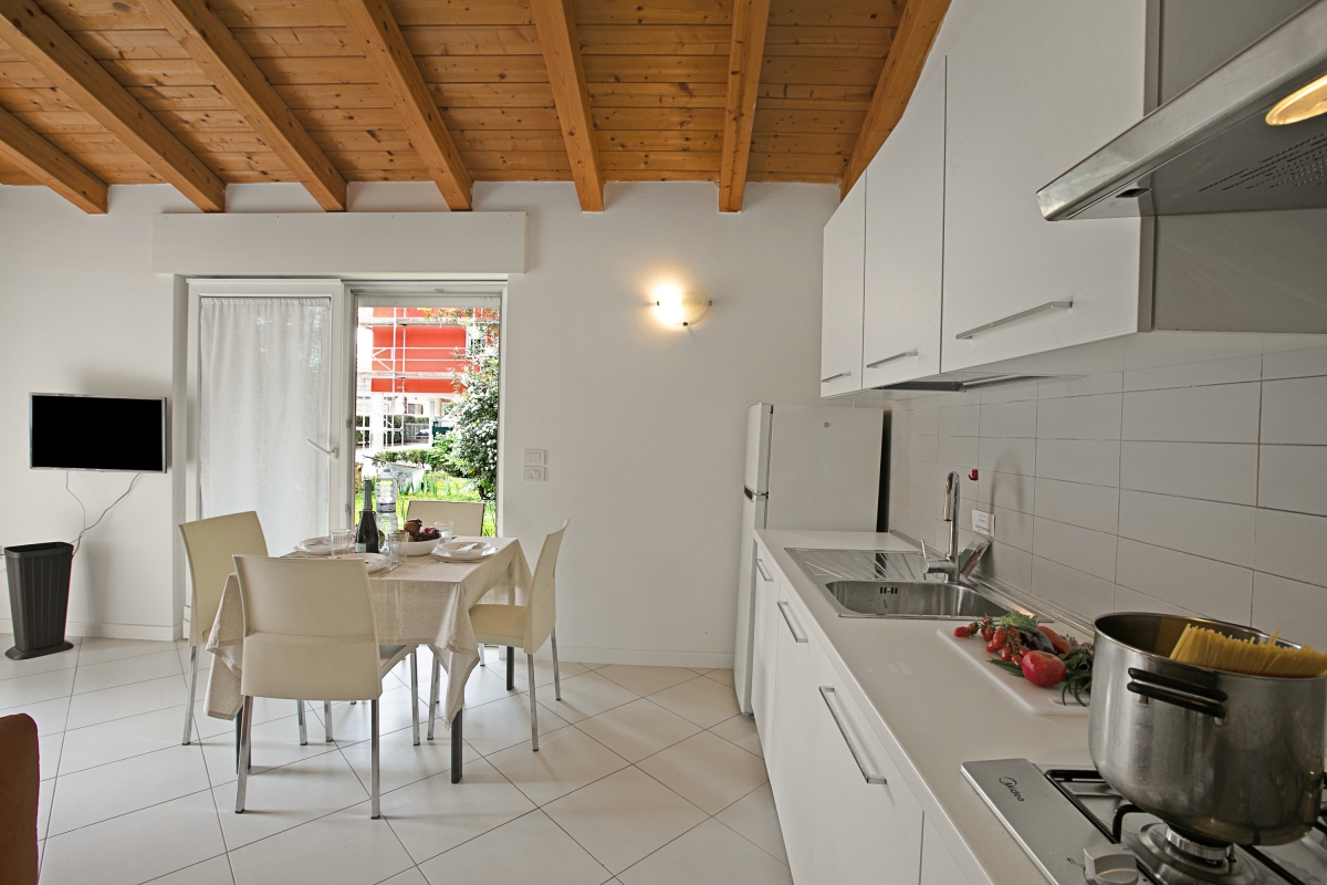 Inside, through sliding glass doors, there is an airy and sleek open-plan living area. With white walls and exposed wooden beams throughout, the decor is modern and chic. The living room is furnished with a contemporary sofa, a flat-screen TV, a smaller dining table and a smart, fitted kitchen. The kitchen is equipped with a cooker hob, microwave, dishwasher, Moka coffee machine, fridge/freezer and a toaster.