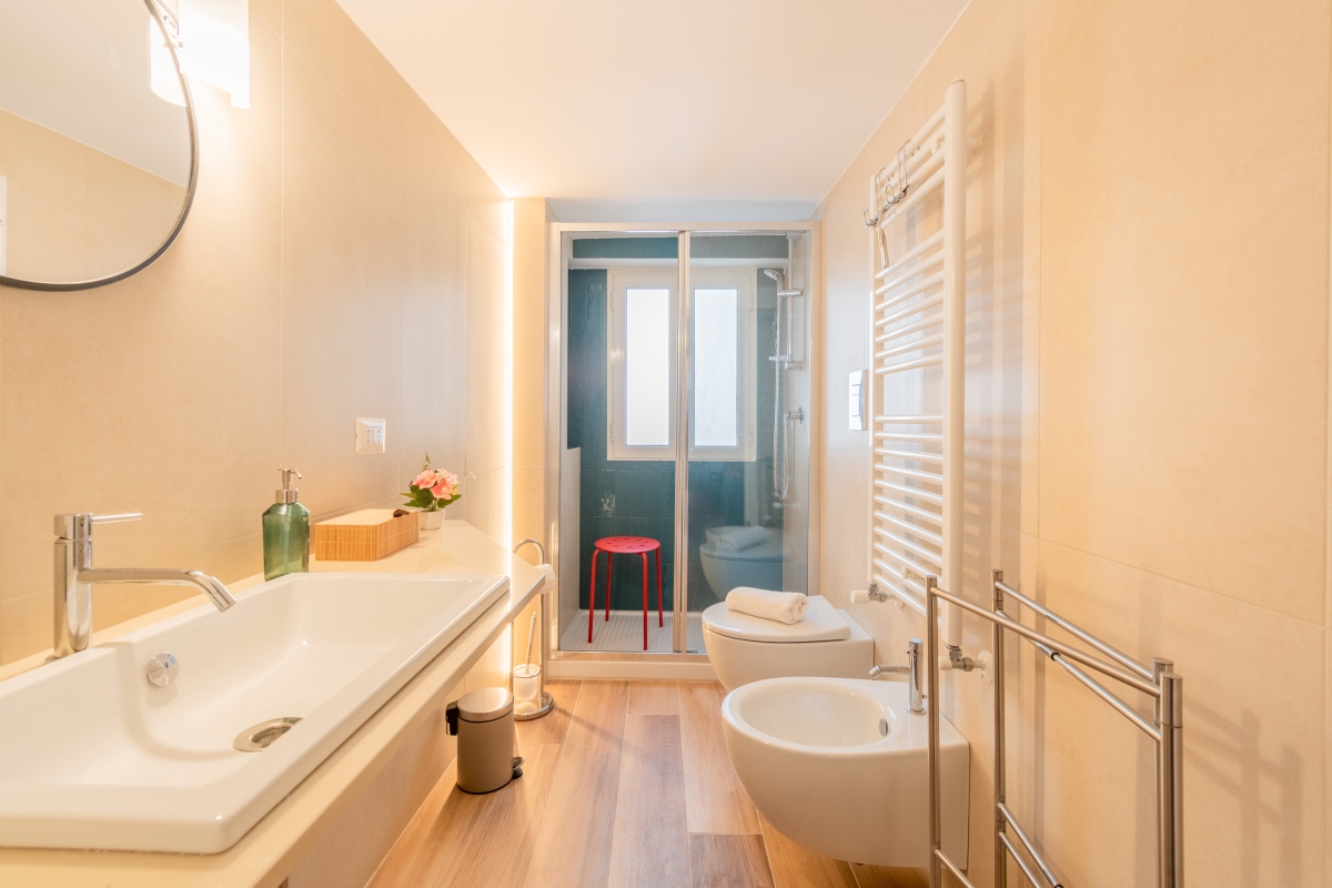 Bathroom 1: A bathroom equipped with a shower, a bidet, a WC and a basin with a mirror.