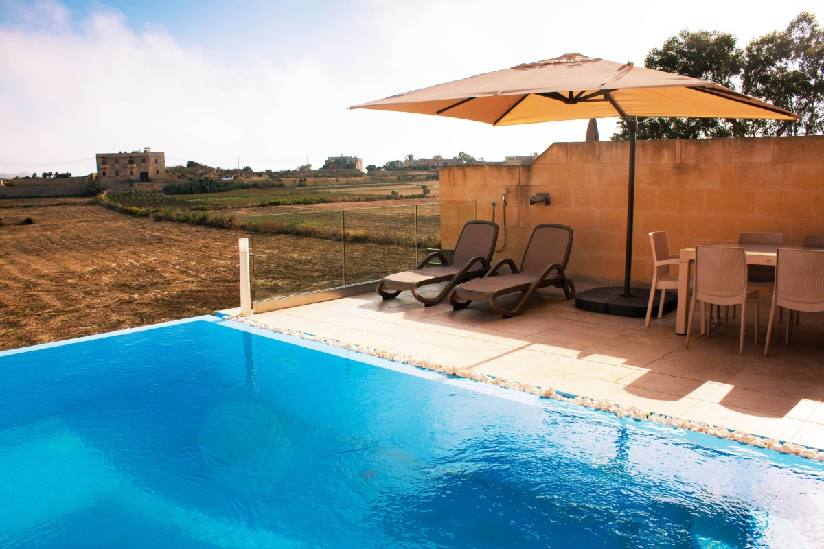 The property is quietly situated on the outskirts of Gharb village and provides the ideal escape for those seeking peace and tranquillity. The house is perfectly set up for outdoor living with; a sun deck, an alfresco dining area, a gas BBQ and the most inviting infinity pool. Here guests can relax and enjoy incredible views across the fields to Gharb’s beautiful Basilica Tal-Madonna.