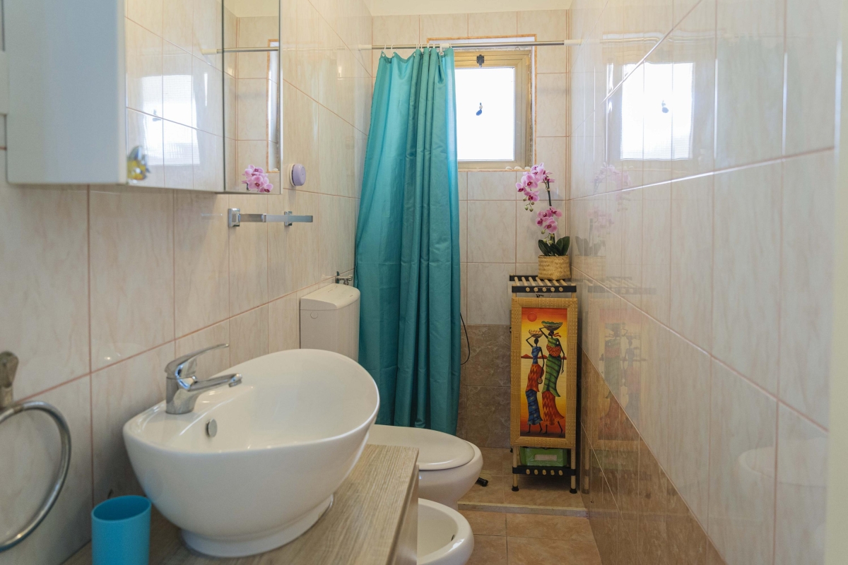 The bathroom has a shower, basin, bidet and WC.