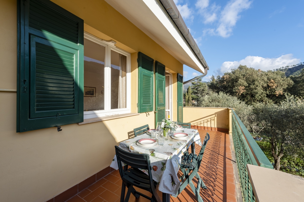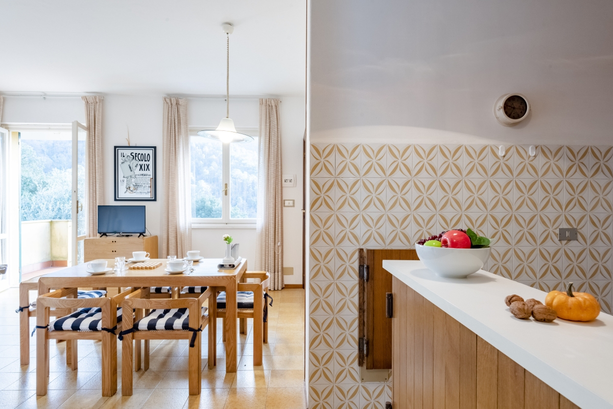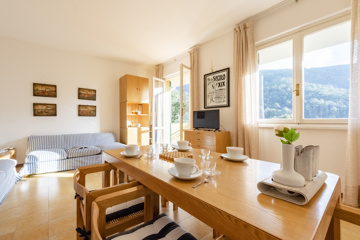Nestled between Genoa and Cinque Terre, this elegant apartment in Deiva Marina offers a serene escape in a quiet location amidst lush greenery. Situated on the first floor, this charming apartment features two bedrooms ideal for accommodating up to 6 guests. Upon entering, you are greeted by an inviting living room that features a dining area with expansive windows that frame picturesque views of the surrounding landscape. Guests can unwind on a plush sofa while enjoying entertainment on the flat-screen TV. The living room opens onto the balcony, ideal for alfresco dining, showcasing breathtaking mountain vistas.